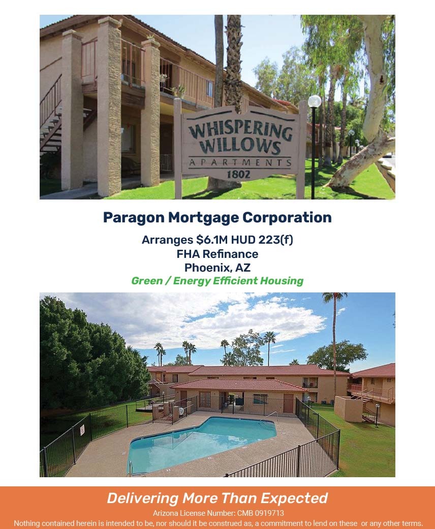 PHOENIX--(BUSINESS WIRE)--Jim Swanson, President of Paragon Mortgage announced that on October 1, 2021, Paragon arranged the refinancing of Whispering Willows Apartments located in Phoenix, Arizona.