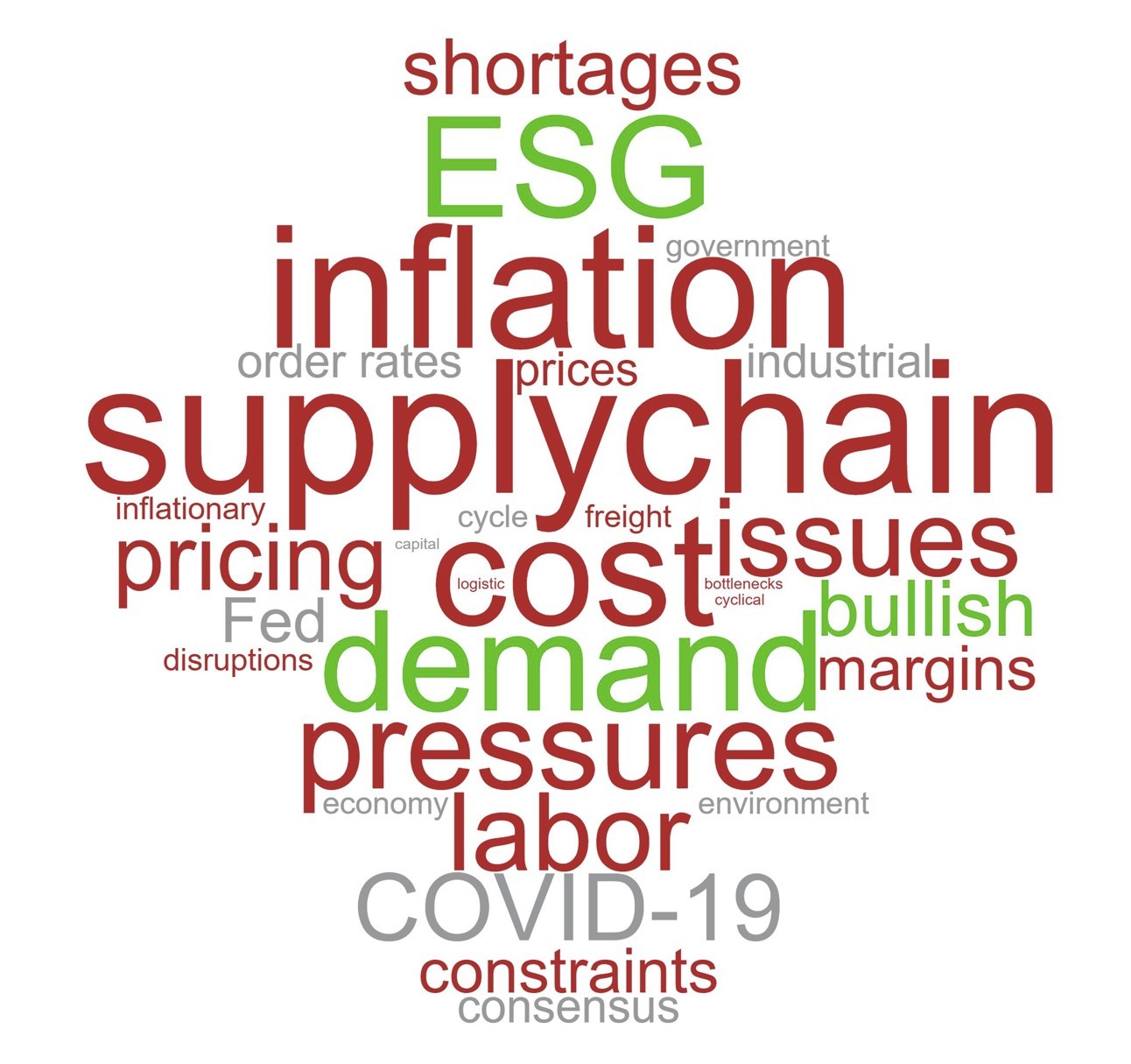 “After industrial executive and investor optimism remained elevated amid soaring global demand in the front half of the year, this will be the first quarter where we see pervasive cost inflation and supply constraints materially impact results,” said Rebecca Corbin, Founder and CEO of Corbin Advisors. “As a tale of two cities emerges - with record demand levels offset by companies’ inability to deliver and the cost to do business ratcheting ever higher each day - we are registering significantly more negative sentiment across the board though investors and executives alike remain optimistic about demand levels remaining in place well into 2022. Sequential backlog, volume and order trends, as well as inventory levels - FOMO at play - will be important to watch this quarter and next, with China geopolitics and consumer sentiment two wildcards.”