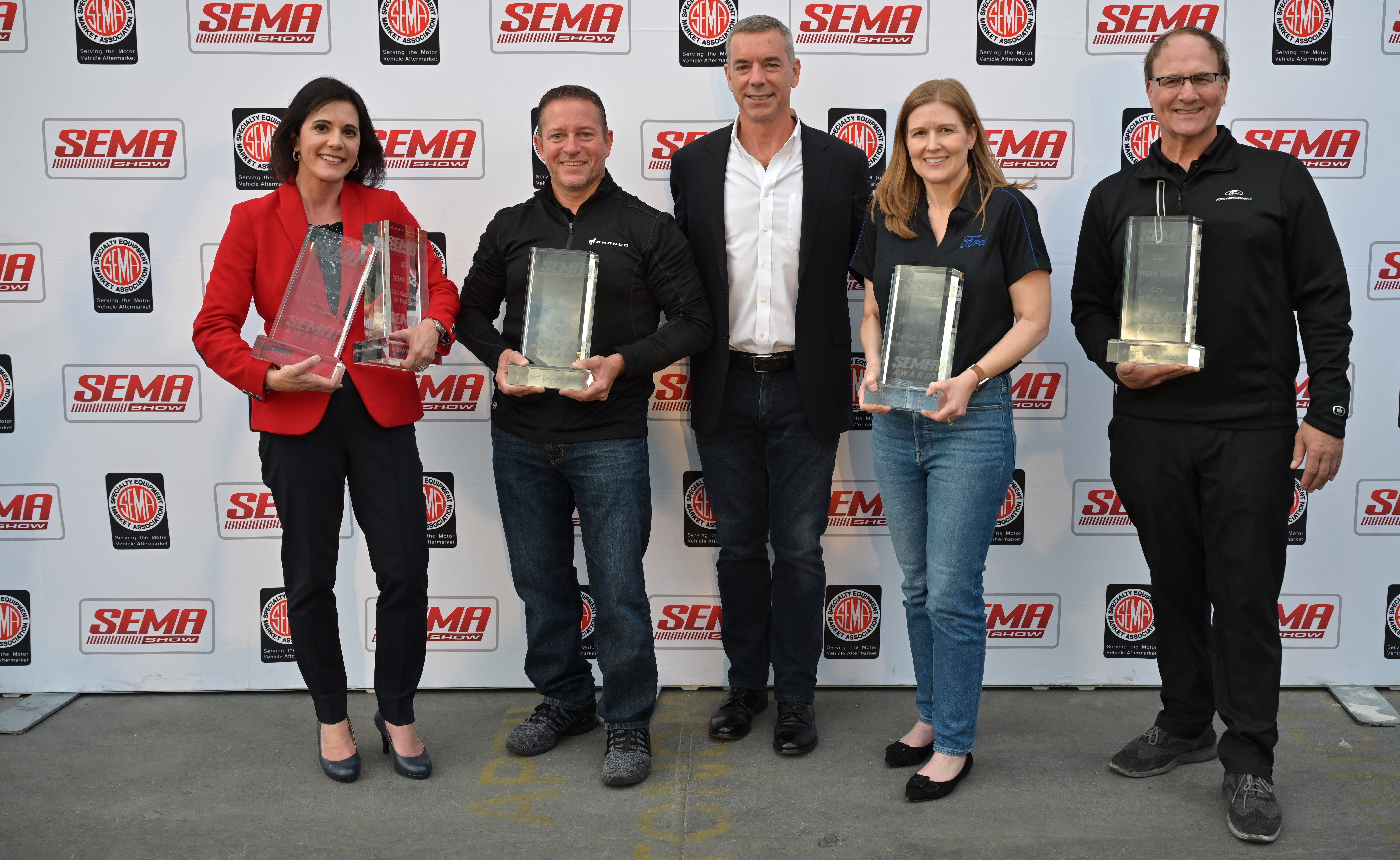 SEMA Award Winners (L to R: Lisa Materazzo, Group Vice President, Toyota Marketing; Dave Pericak, Engineering Director, Unibody Applications, Ford; Chris Kersting, President and CEO, SEMA; Jackie DiMarco, F-Series Chief Program Manager, Ford; Phil Collaraeno, Executive Director for Global Programs, Ford) (Photo: Business Wire)