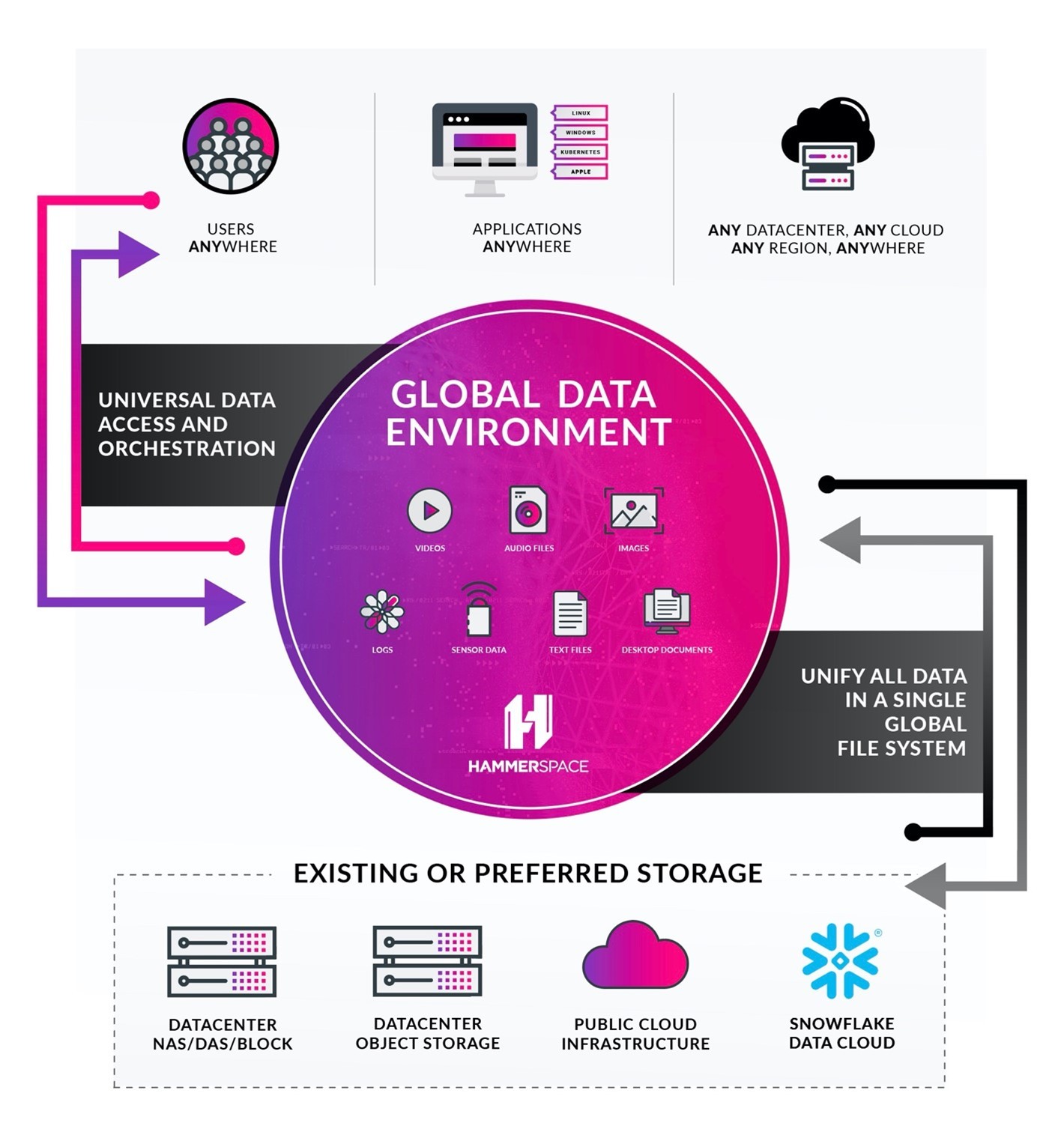 Hammerspace recognized that data is significantly less valuable when it is isolated in different silos and trapped in various locations. The Hammerspace Global Data Environment provides the world’s first and only solution to connect global users and applications with their data on any existing data center infrastructure or preferred public cloud service.