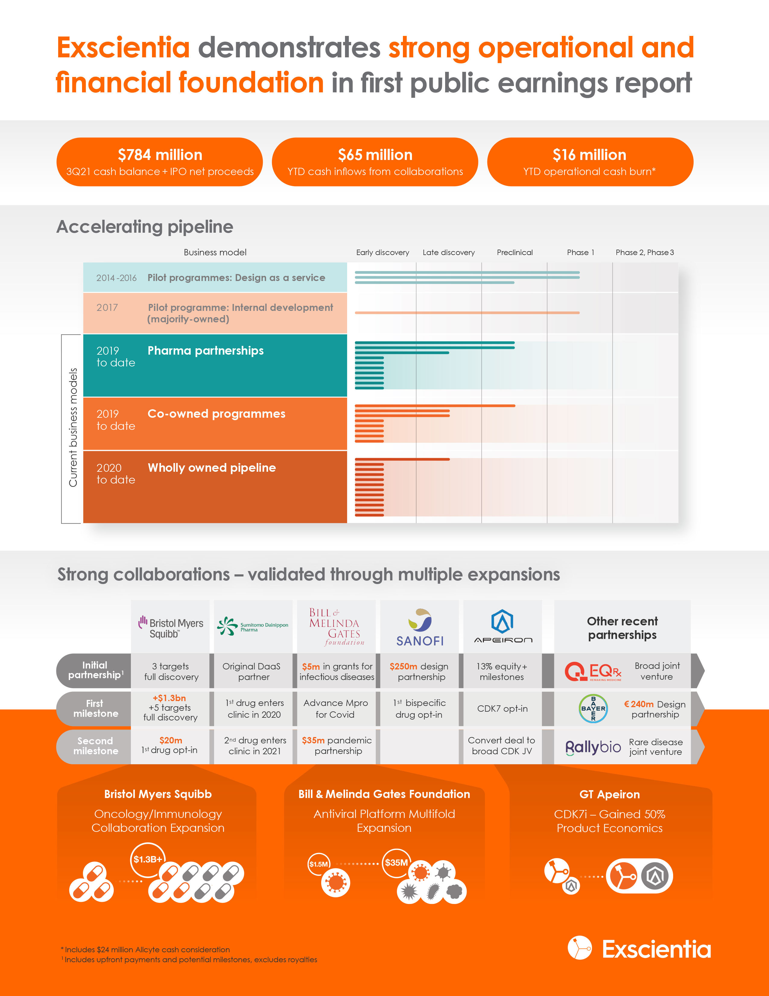 Recente ontwikkelingen in de pijplijn, samenwerkingen en activiteiten van het bedrijf, evenals financiële resultaten voor het derde kwartaal eindigend op 30 september 2021 worden hieronder samengevat. Daarnaast zal Exscientia een conference call houden op donderdag 18 november om 13.30 uur. GMT / 8:30 a.m. ET om details te geven over de bedrijfsmodellen die ten grondslag liggen aan de pijplijn van het bedrijf met meer dan 25 programma’s.