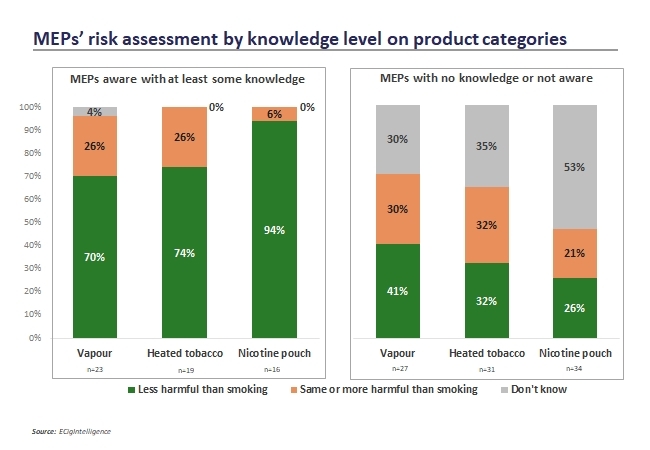 Une enquête réalisée par ECigIntelligence et TobaccoIntelligence montre que 70% des eurodéputés ayant une certaine connaissance des cigarettes électroniques les considèrent comme moins nocives que le tabagisme, contre 41% seulement des eurodéputés n’ayant aucune connaissance du sujet.
