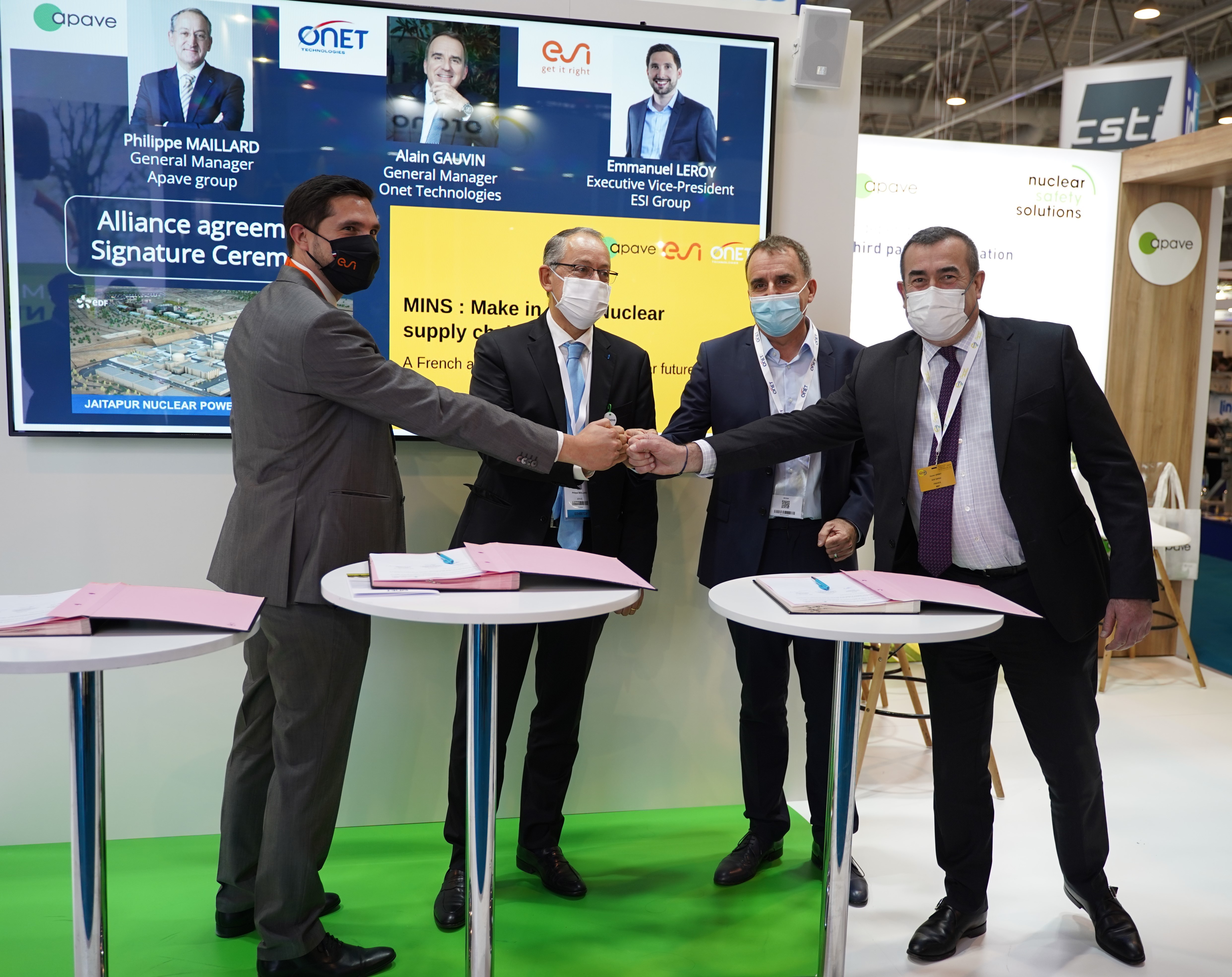 Philippe Maillard, Directeur général du Groupe APAVE, Emmanuel Leroy, EVP Product, Innovation & Industry Solutions d’ESI Group et Alain Gauvin, Directeur général d’ONET Technologies, ont signé ce jour au WNE 2021, en présence de Xavier Ursat, Directeur Exécutif Groupe en charge de la Direction Ingénierie et Projets Nouveau Nucléaire d’EDF, une déclaration d’intention commune, structurant l’alliance MINS, associant ainsi leurs compétences sur le marché hors-norme des EPR indiens du site de Jaitapur.