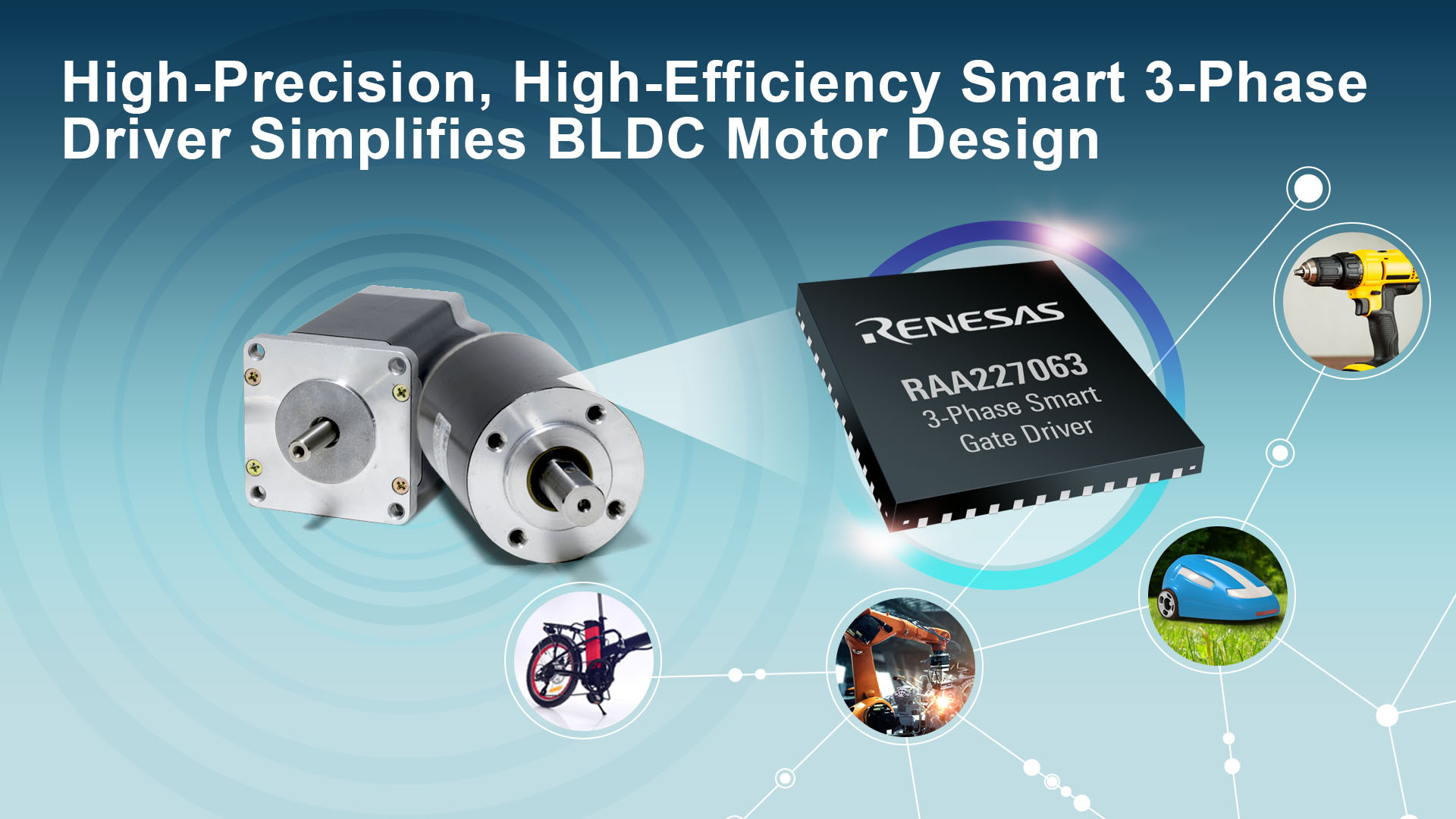TOKYO--(BUSINESS WIRE)--Renesas Electronics Corporation (TSE:6723), a premier supplier of advanced semiconductor solutions, today introduced the RAA227063 Smart Gate Driver for brushless DC (BLDC) motor applications. The new device is programmable via an SPI interface, enabling it to support both motors with rotor position sensors and sensorless applications. It also provides programmable gate drive voltage, offering support for N-channel MOSFETs typically used in motor inverter designs, as well as GaN FETs used where high power density is required. The RAA227063 is scalable to support multiple MCUs, including a wide range of Renesas offerings.