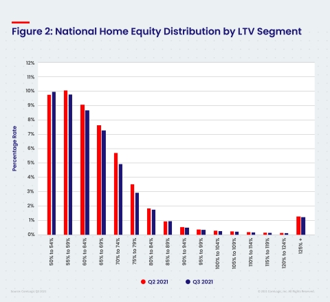 IRVINE, Calif.--(BUSINESS WIRE)--CoreLogic, a leading global property information, analytics and data-enabled solutions provider, today released the Homeowner Equity Report for the third quarter of 2021. The report shows U.S. homeowners with mortgages (which account for roughly 63% of all properties) have seen their equity increase by 31.1% year over year, representing a collective equity gain of over $3.2 trillion, and an average gain of $56,700 per borrower, since the third quarter of 2020.