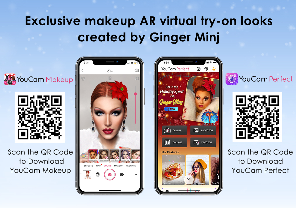 “It is a dream come true to see some of my favorite shades and styles available for virtual try-on worldwide during the holiday season,” says Ginger Minj. “Beauty and makeup play such an important role in the way I express myself, and by partnering with the YouCam Makeup and YouCam Perfect apps, users can partake in that joy with me and celebrate the holidays in style.”