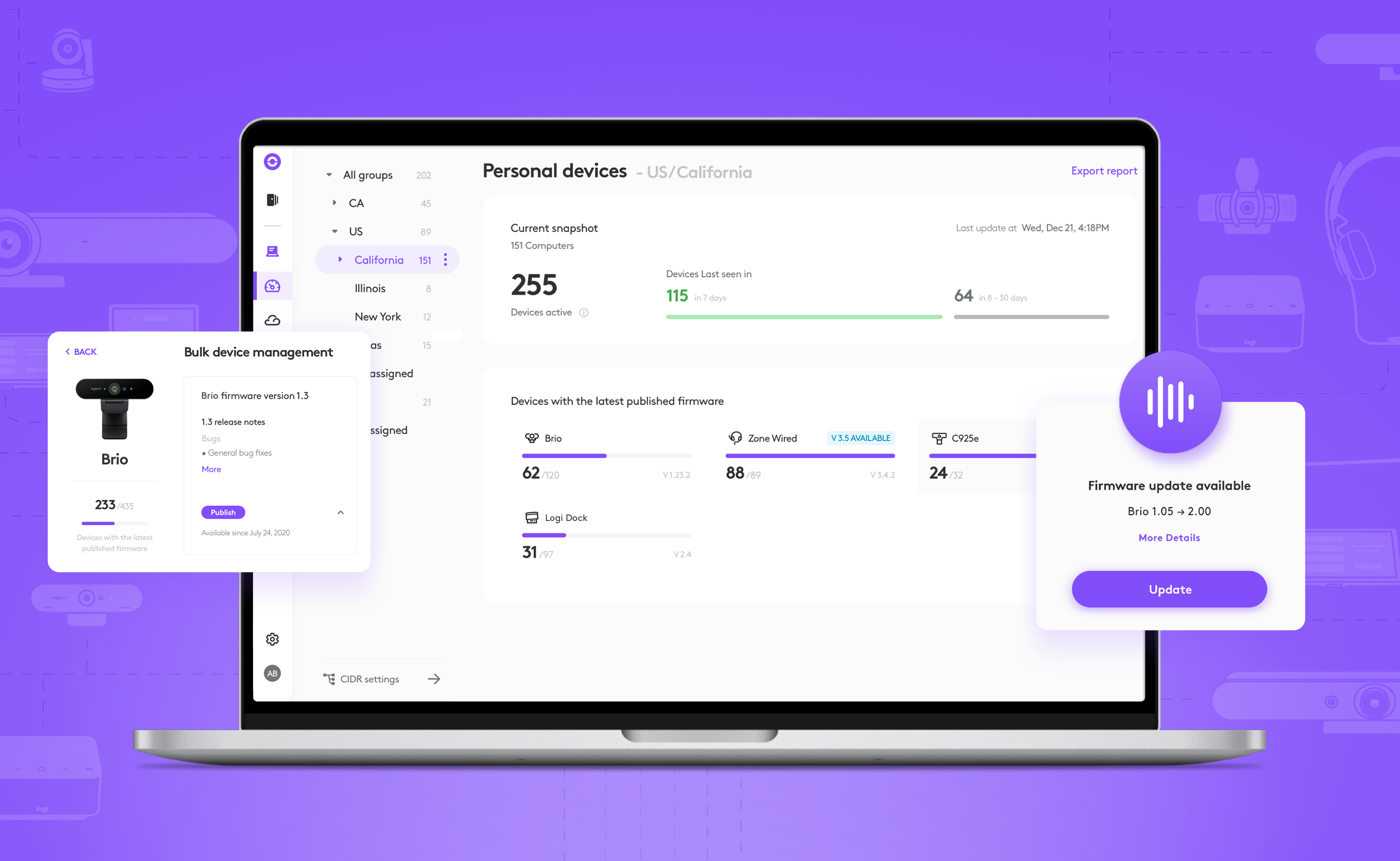 It's easy for IT to mass enroll their entire fleet of workstations with Logi Tune, while giving IT visibility into device status and enabling end users to personalize their Logitech webcams, headsets, and Logi Dock.