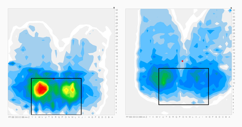 ATF Medical uses pressure mapping to identify potential pressure injuries and to help prevent or treat wounds. The hot (red) colors on the left show the pressure is unevenly distributed in the current seated position, making it likely an injured worker will develop pressure-related injuries. The cool (blue) colors on the left show the seated position after the pressure is evenly distributed. (Image provided by Vista Medical.)