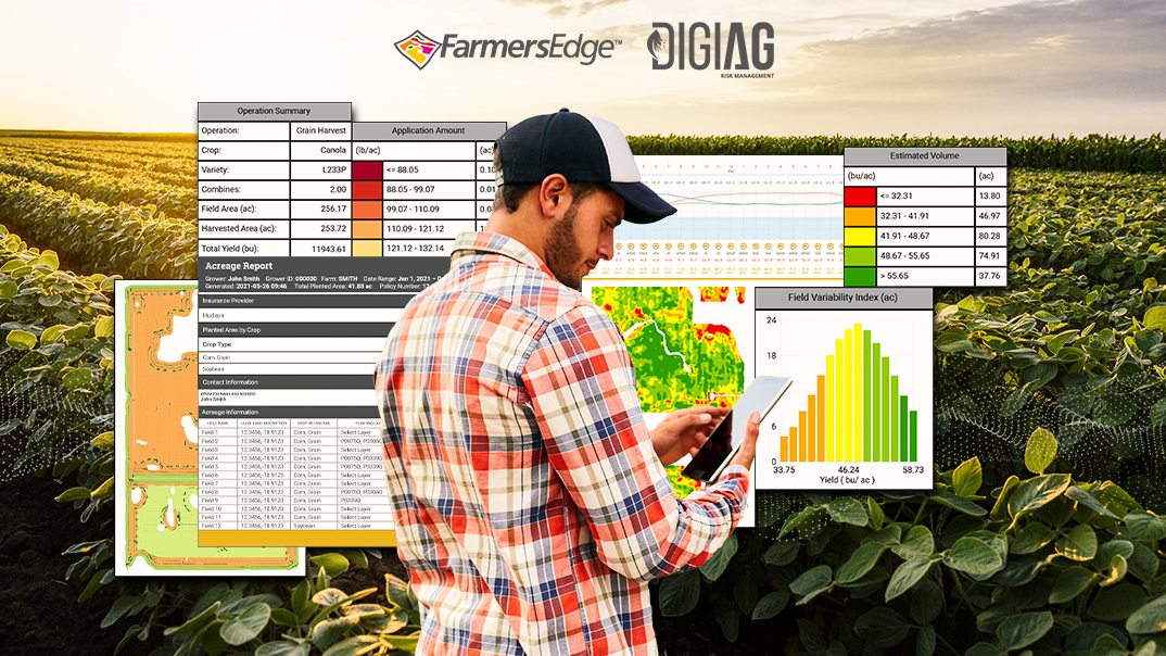 All farm data is collected passively using Farmers Edge solutions (including high-resolution, high-frequency satellite imagery; weather conditions and events, such as hail or flood; predictive crop growth stage, disease and pest, and yield models; detailed acreage and production reports; and more) to provide seamless access to critical information required for crop insurance reporting. Digitizing the flow of insurance data using this novel and comprehensive structure delivers substantial time savings, reduces claims leakage, and ensures a high level of validity and reporting transparency for all stakeholders.