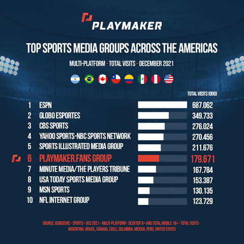 TORONTO--(BUSINESS WIRE)--Playmaker (TSX-V: PMKR; OTCQX: PMKRF), the digital sports media company that delivers authentic content experiences through its portfolio of sports media and technology brands, has been ranked by Comscore as the number one regional digital sports media group in Latin America and the sixth largest digital sports media group across the Americas with 179.6 million visits in the month of December 2021.