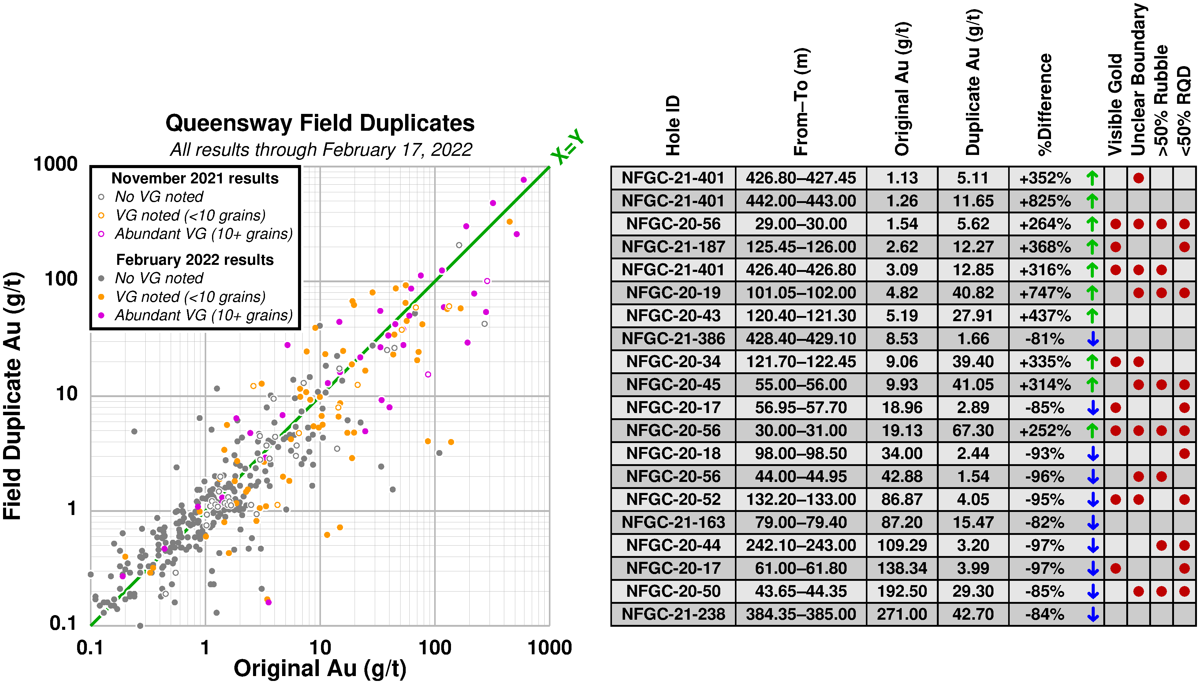 - Mo Srivastava summarizes his findings as follows: “The field duplicate data from Queensway confirm that the very high natural in-situ variability creates potential for large differences in field duplicates in drill hole intervals with abundant visible gold. Although there are several intervals with striking differences, both positive and negative, these represent only a few percent of the several hundred field duplicates now available. A statistical comparison of all duplicate and original sample pairs, including the most variable, supports the view that the assays are accurate; the sampling procedures at site, and the preparation and analysis procedures at the lab, have not imparted any systematic bias to the reported gold grades.”
