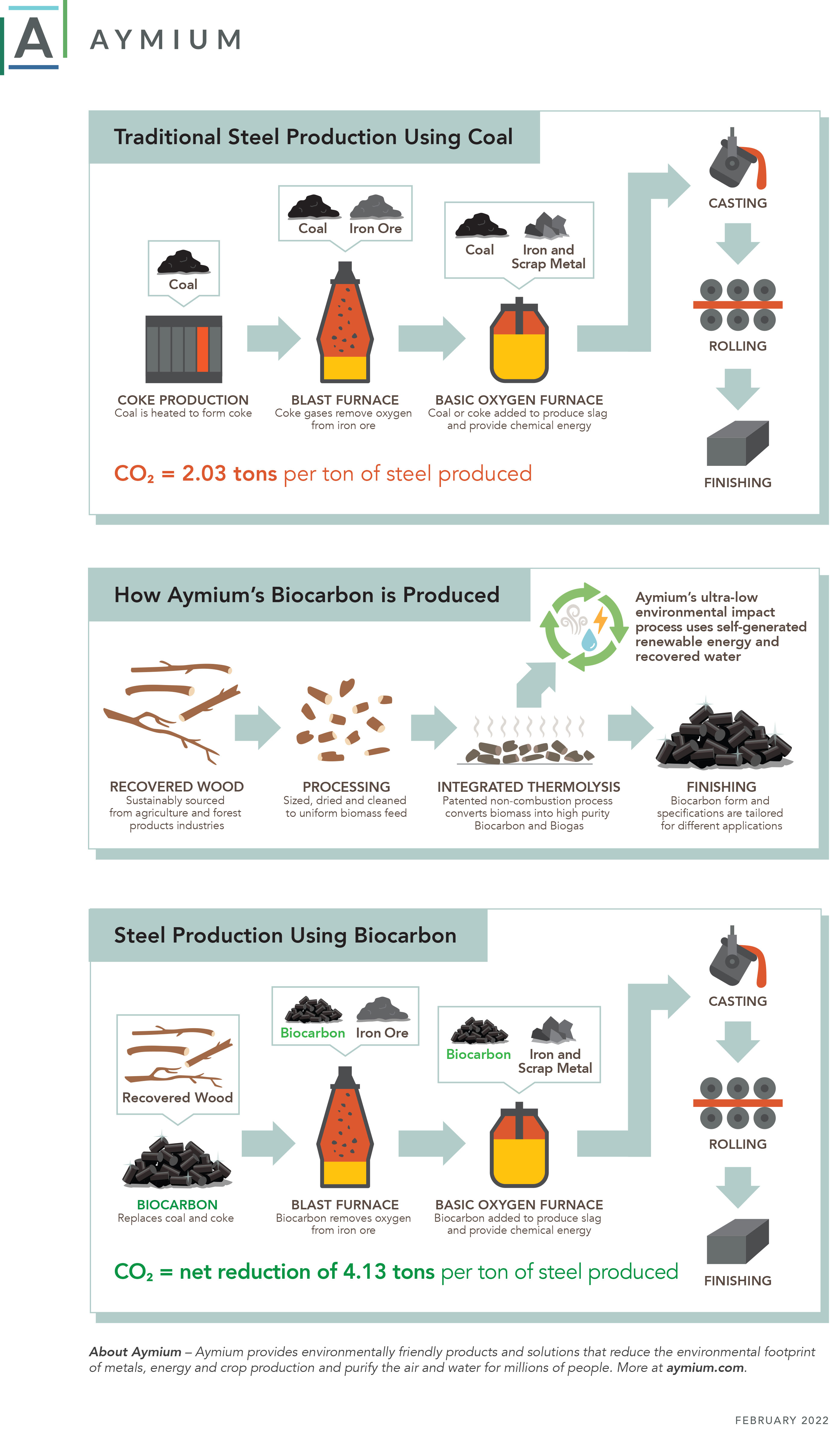 Aymium opera la mayor instalación de producción de biocarbono avanzado de Norteamérica, situada cerca de Marquette (Michigan). El proceso patentado de Aymium convierte la biomasa certificada de origen sostenible en biocarbono utilizando la termólisis integrada. El proceso sin combustión convierte la biomasa en biocarbono y biogás de alta pureza, recupera y recicla el agua de la biomasa y se alimenta de energía renovable autogenerada. El proceso de Aymium produce el único insumo de carbono negativo demostrado comercialmente para la producción mundial de acero.