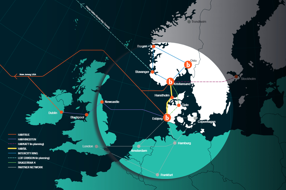 Nieuw systeem met hoge capaciteit om te dienen als de veilige hoofdvezelroute voor internationaal dataverkeer tussen Noorwegen en continentaal Europa