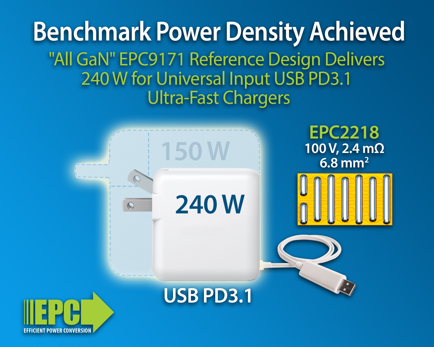 EL SEGUNDO, Calif.--(BUSINESS WIRE)--EPC announces the availability of the EPC9171, a 90 V – 265 V universal AC input to 15 V – 48 V DC output power supply designed for USB PD3.1 ultra-fast chargers. This reference design can deliver 240 W maximum output power at 48 V output voltage and 5 A load current. A power density of about 1.1 W/cm3 is achieved by employing gallium nitride (GaN) power switches operating at high switching frequencies in both the primary and secondary circuits.