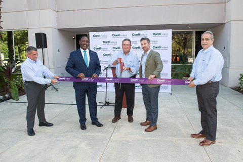 Conti Federal CEO, Peter Ceribelli, mans the scissors for the official ribbon cutting to celebrate the relocation of the Conti Federal headquarters to Orlando, FL. He is assisted by Orange County Mayor, Jerry Demings (left) and Orlando Economic Partnership President and CEO, Tim Giuliani (right). The ribbon is being held by Conti Federal COO, Lou Zecca (left) and Conti Federal Vice President of Business Development, Aldo Gonzalez (right). (Photo: Business Wire)