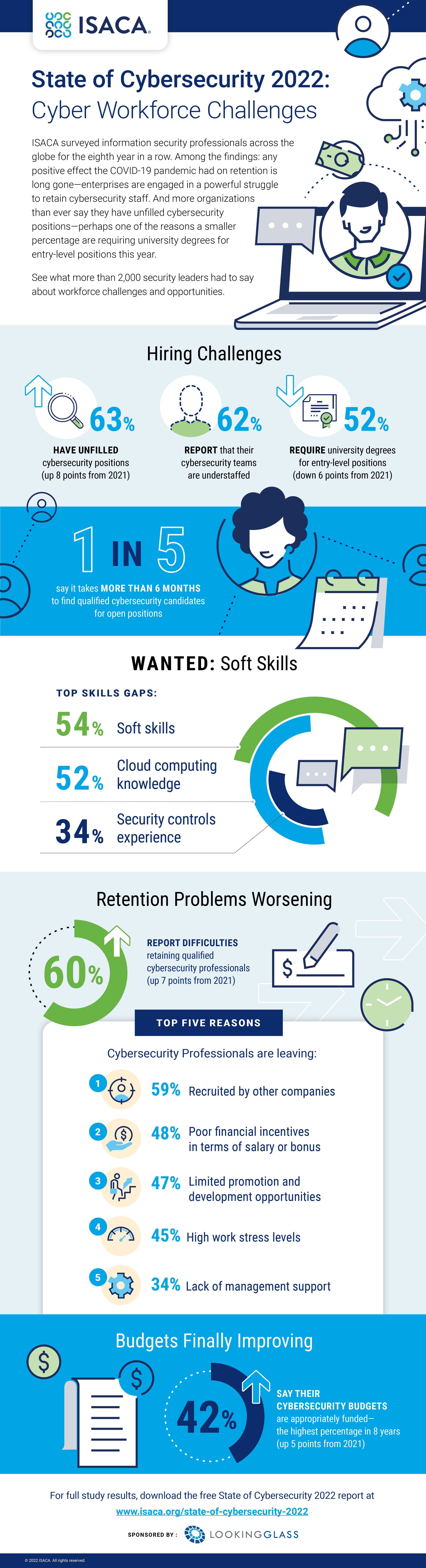 SCHAUMBURG, Illinois--(BUSINESS WIRE)--El fenómeno de las dimisiones en masa sigue afectando a los sectores de todos los ámbitos, pero es especialmente desafiante en los campos de mayor demanda como la ciberseguridad. Según el nuevo informe de ISACA, State of Cybersecurity 2022: Global Update on Workforce Efforts, Resources and Cyberoperations (Estado de la ciberseguridad en 2022: actualización global de la mano de obra, los recursos y las ciberoperaciones), a las empresas les resulta más difícil que nunca contratar y retener a profesionales en ciberseguridad cualificados y gestionar el déficit de competencias.