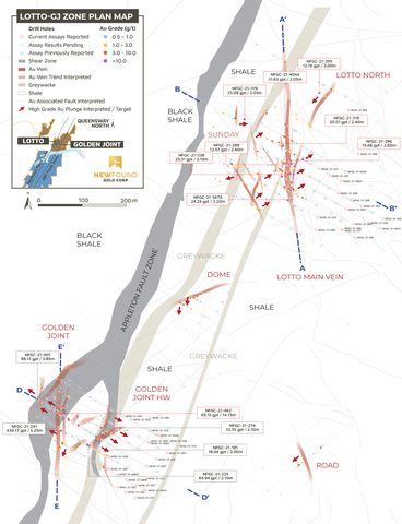 VANCOUVER, British Columbia--(BUSINESS WIRE)--New Found Gold Corp. (“New Found” or the “Company”) (TSX-V: NFG, NYSE-A: NFGC) is pleased to announce assay results from 23 diamond drill holes designed to expand the high-grade gold mineralization at the Golden Joint and Lotto discoveries located within a 1km segment of the Appleton Fault Zone (‘AFZ’) north of the Keats Zone. This corridor is part of the +20km of prospective strike along the regional-scale Appleton and JBP fault zones on the Queensway project that New Found is targeting with a 400,000m drill campaign. The Queensway project comprises an approximately +1500km2 area with initial focus in areas accessed via the Trans-Canada Highway approximately 15km west of Gander, Newfoundland.