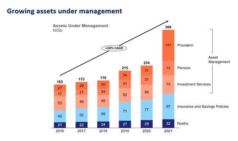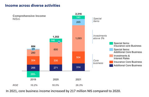 The Phoenix continued to execute its strategy in 2021 to strengthen the Group's focus on products and services, offering the highest return on capital (26.3%) while maintaining market leadership in the insurance sector. The results of the strategy are clearly reflected in the Group's profits (2.316 billion NIS) the AUM amount (369 billion NIS) and the dividend distributed (621 Million NIS- 2.47 DPS).