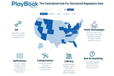 MIAMI--(BUSINESS WIRE)--Odds On Compliance, the industry-leading technology and consultancy firm specializing in sports betting, iGaming, and gambling regulatory compliance in the U.S. and abroad, has launched Playbook, the game-changing technology platform that provides the most comprehensive overview ever produced of the U.S. sports betting, iGaming, daily fantasy sports, and iLottery regulatory environment, updated in real time as information changes state-by-state. Playbook provides users with one-click access to state document libraries which are carefully curated, managed, and automatically updated to ensure all data is as current as the information published on all state regulatory agency repositories.