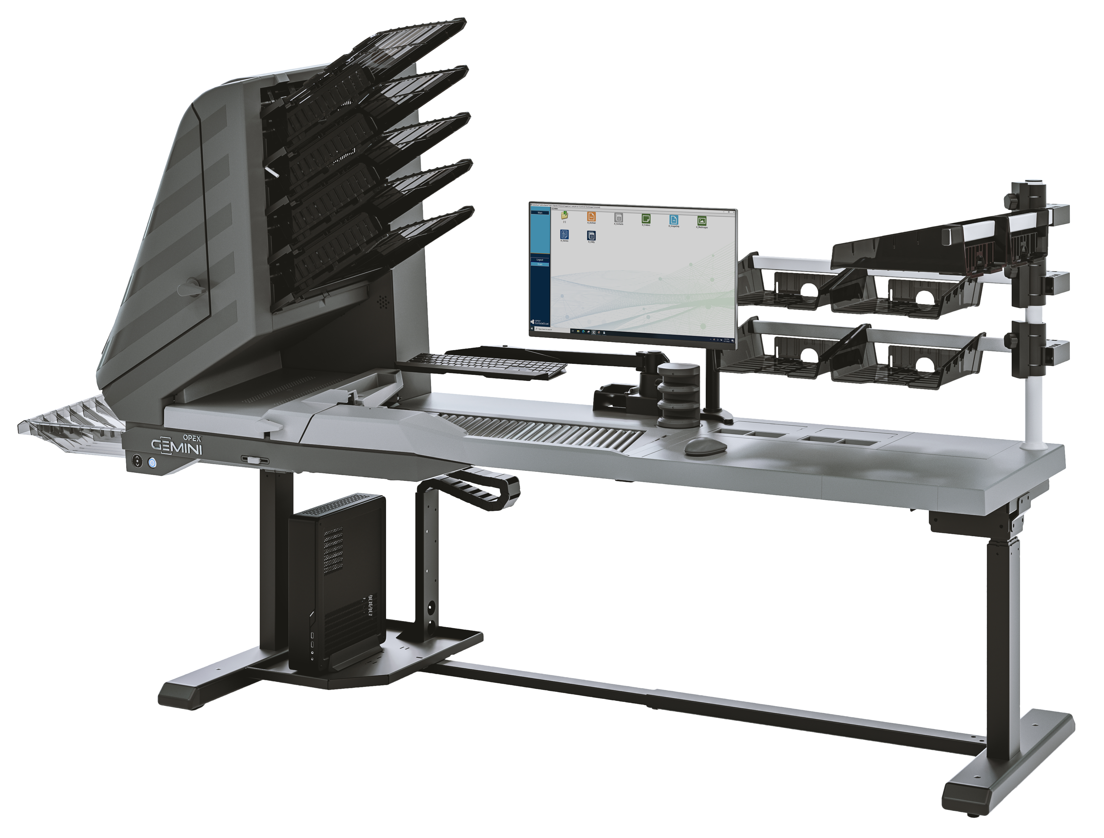 Com velocidades de digitalização de até 240 páginas por minuto, o scanner Gemini apresenta um design de alimentador duplo e a capacidade de alimentação contínua. Seus cinco escaninhos de classificação programáveis permitem o uso de recursos exclusivos de classificação e facilitam o manuseio de documentos. O conforto e a produtividade do operador são aprimorados ainda mais por meio do design ergonômico com área de trabalho personalizável e mesa de altura ajustável.