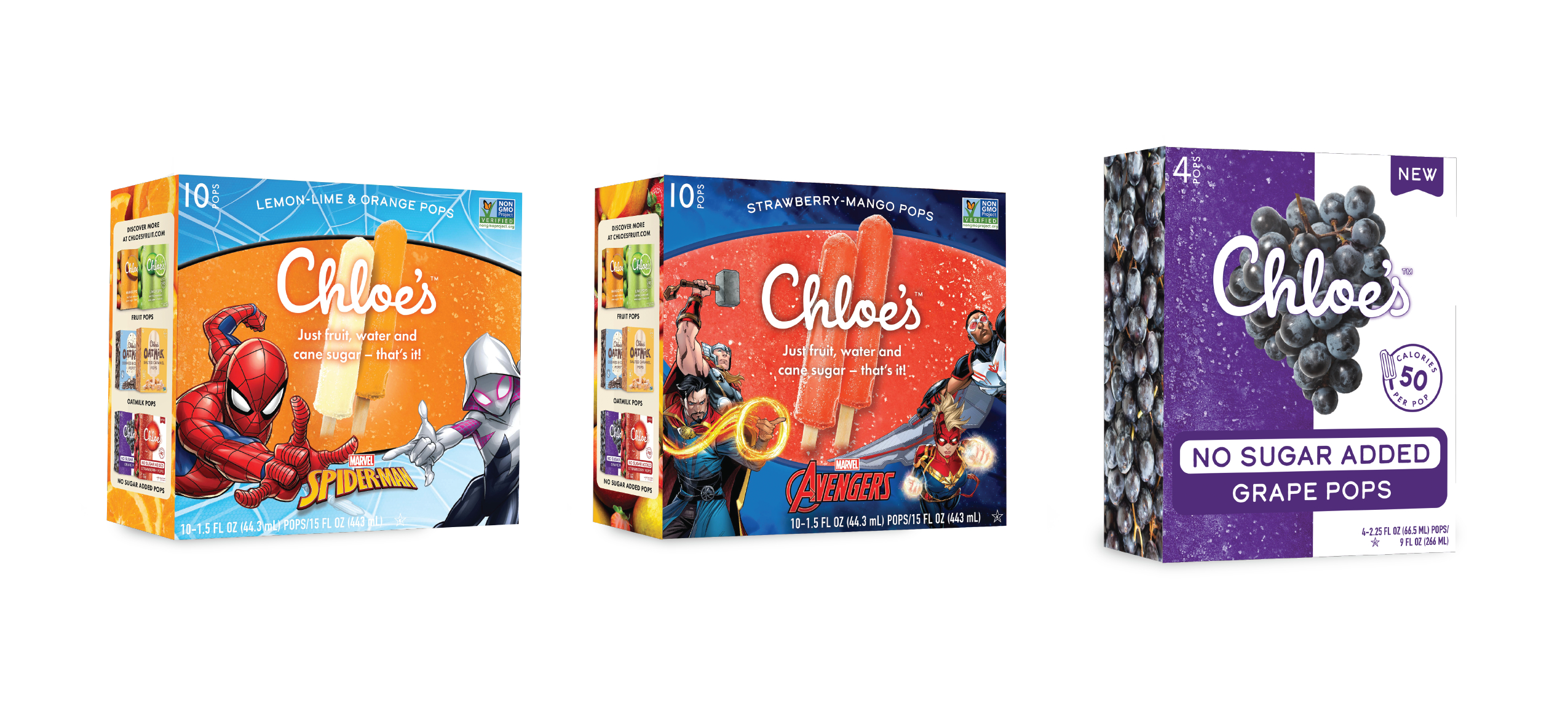 NEW YORK--(BUSINESS WIRE)--Chloe’s, the leading innovator of non-dairy frozen novelties, today announced the launch of three new innovations and an expanded retail presence across the country, as consumers continue to opt for cleaner, simple-ingredient frozen treats without artificial ingredients. The new varieties include two new Marvel inspired SKUs: tangy Lemon-Lime & Orange variety pack featuring Spider-Man and Ghost-Spider, and a perfectly sweet Strawberry-Mango Pop featuring Avengers characters- Thor, Doctor Strange, The Falcon and Captain Marvel. Chloe’s also added to its No Sugar Added offerings with its deliciously juicy Grape option.
