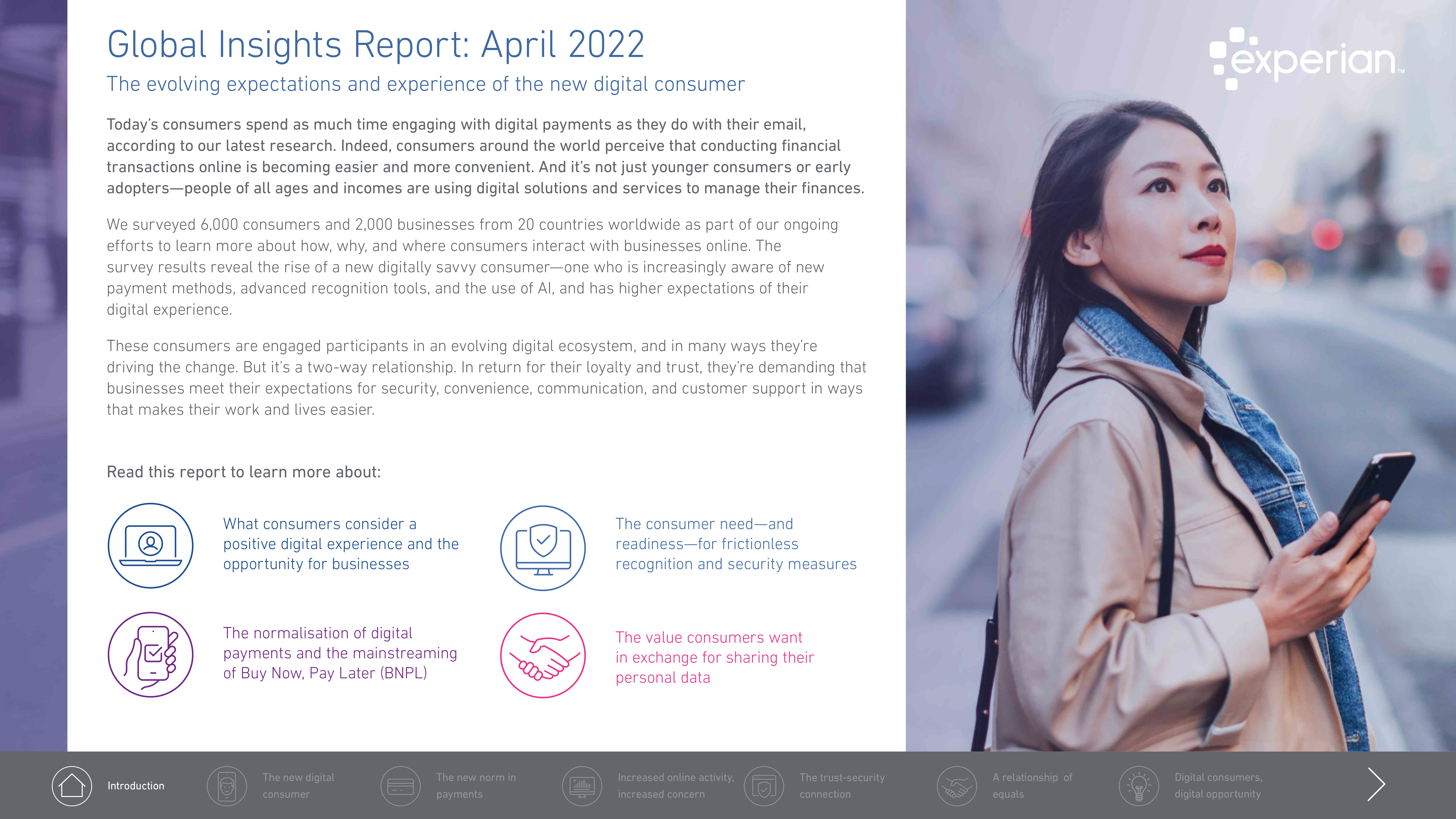 為了進行這項研究,益博睿調查了20個國家的6,000名消費者和2,000家企業,旨在瞭解消費者和企業經濟前景、財務狀況、線上行為等資訊。調查涵蓋的國家有澳洲、巴西、智利、中國、哥倫比亞、丹麥、德國、印度、印尼、愛爾蘭、義大利、馬來西亞、荷蘭、挪威、秘魯、新加坡、南非、西班牙、英國和美國。本報告是探索過去七年裡消費者數位偏好和商業策略重大轉變之系列研究中的最新成果。