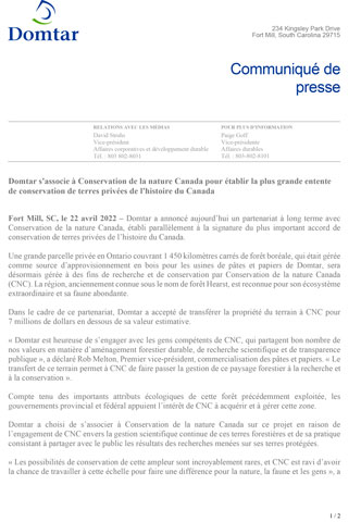 « Domtar est heureuse de s’engager avec les gens compétents de CNC, qui partagent bon nombre de nos valeurs en matière d’aménagement forestier durable, de recherche scientifique et de transparence publique », a déclaré Rob Melton, Premier vice-président, commercialisation des pâtes et papiers. « Le transfert de ce terrain permet à CNC de faire passer la gestion de ce paysage forestier à la recherche et à la conservation ».