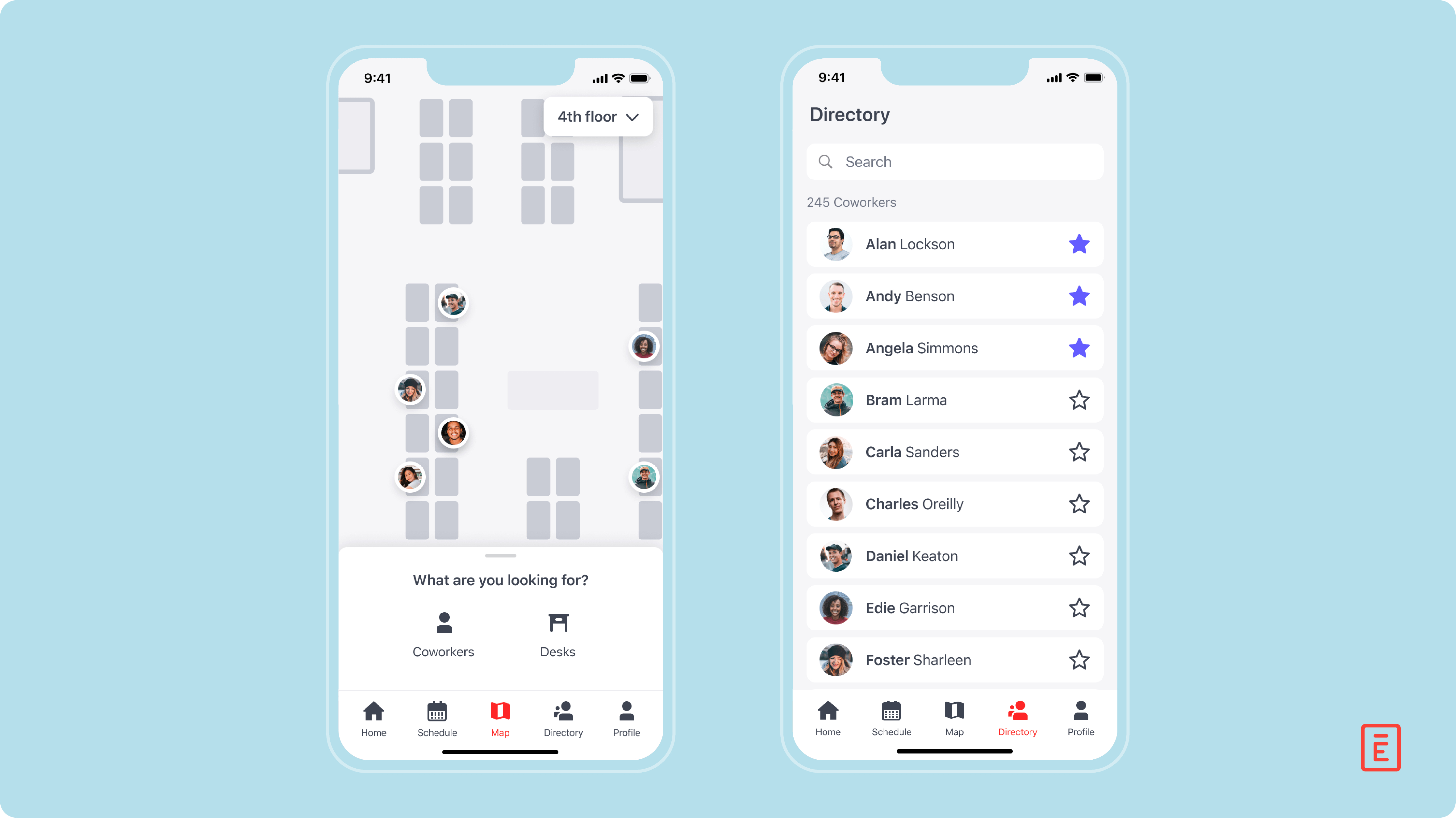 Favorite coworkers for easier scheduling and collaboration, upload profile pics and find that perfect desk
