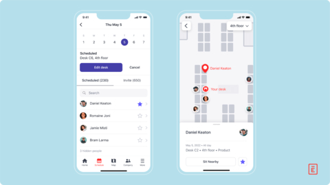 Through the mobile app, employees can coordinate schedules with coworkers. They can book desks and meeting rooms, and receive notifications of visitors and deliveries. Employees can also navigate the workspace, upload Covid vaccination and test results, and more.
