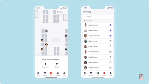 A través de la aplicación móvil, los empleados pueden coordinar horarios con sus compañeros de trabajo. Pueden reservar escritorios y salas de reuniones, y recibir notificaciones de visitantes y entregas. Los empleados también pueden navegar por el espacio de trabajo, cargar resultados de vacunas y pruebas de Covid, y más.