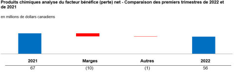 - Le bénéfice net du secteur Produits chimiques a été de 56 millions de dollars pour le trimestre, comparativement à 67 millions de dollars au premier trimestre de 2021, alors que les marges diminuaient après avoir atteint des sommets inégalés.