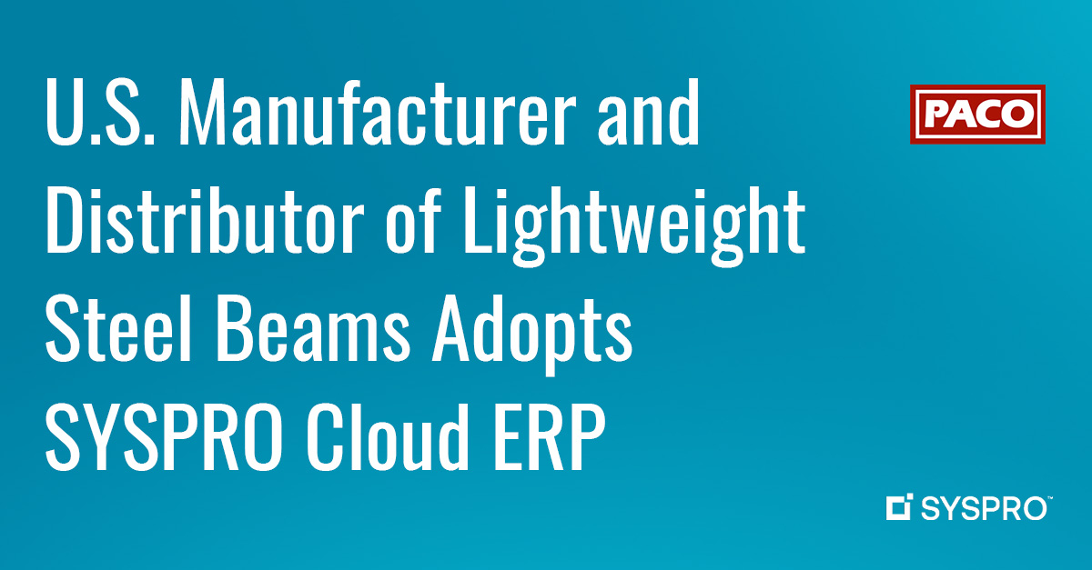 TUSTIN, Calif.--(BUSINESS WIRE)--SYSPRO, a global provider of ERP software, today announced that PACO Steel and Engineering Corp has chosen to adopt SYSPRO ERP Software as it upgrades to a Cloud ERP platform.