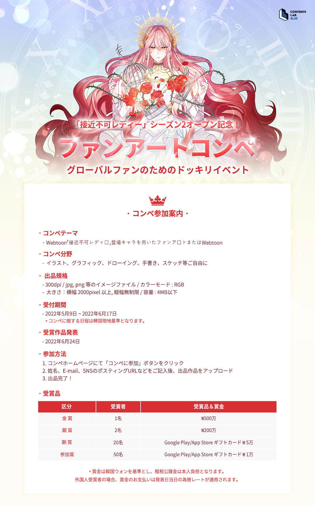 韓国ソウル--(BUSINESS WIRE)--(ビジネスワイヤ) -- (ビジネスワイヤ) -- ウェブトゥーンプロダクションであるContentsLabBlue(代表コ・ヨント)が「接近不可レディー」のシーズン2オープンを記念してファンアートコンペを開催する。今回のファンアートコンペは「ピッコマ」を通じて連載中であるウェブトゥーン「接近不可レディー」が日本及び韓国、タイ、アメリカなど全世界から愛され大ヒットしたことに因んだグローバルイベントである。