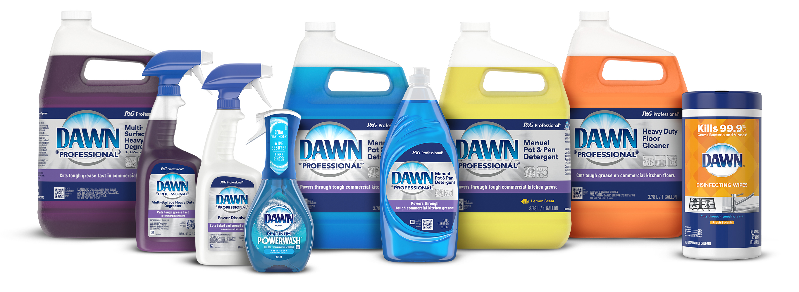 Dawn Professional Multi-Surface Heavy Duty Degreaser – New to the product lineup and designed with commercial kitchens in mind, the multi-surface degreaser cuts tough grease on food contact surfaces 2x faster than the leading professional competitor.