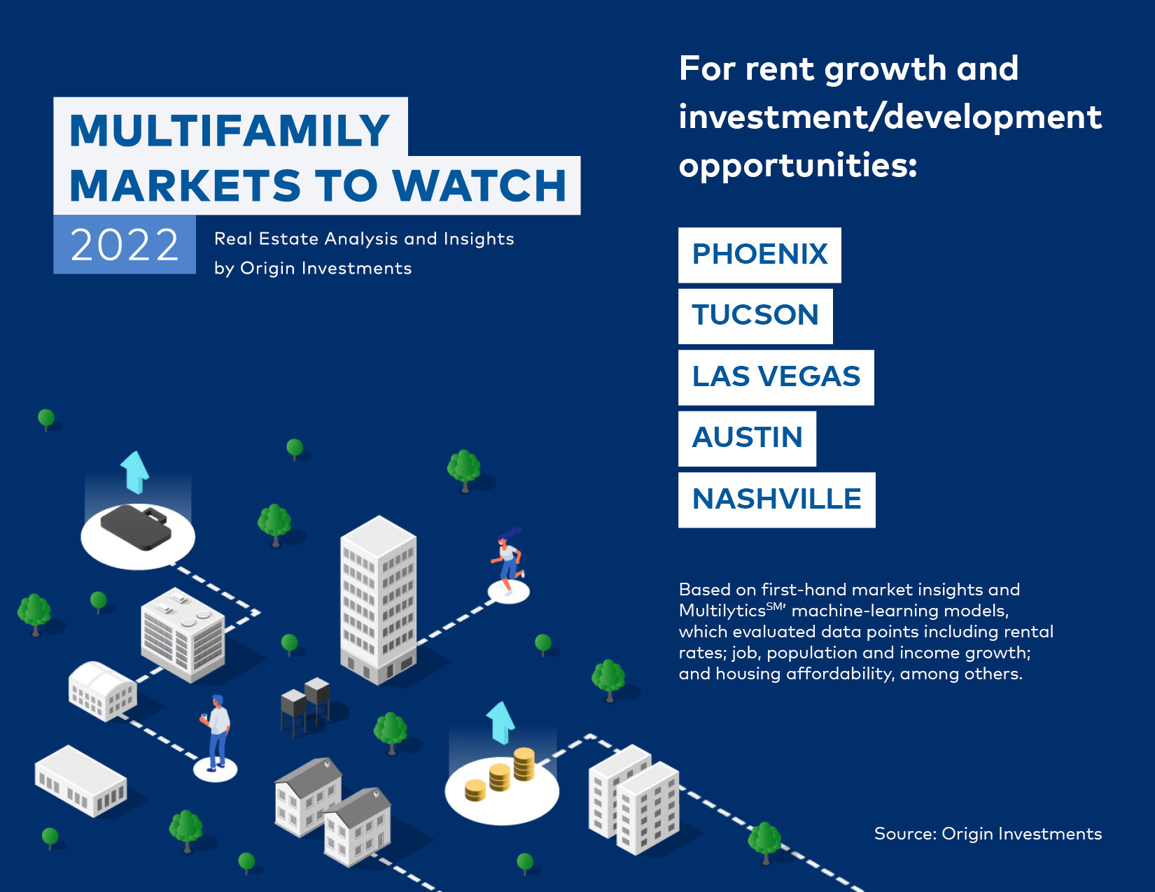 CHICAGO--(BUSINESS WIRE)--Origin Investments, a leading private equity real estate fund manager, today released a new report created using Origin Multilytics, its proprietary suite of machine-learning models, and insights from its expert team of regional deal acquisition officers. Multifamily Markets to Watch 2022 cites Sun Belt markets Phoenix, Tucson, Las Vegas, Austin and Nashville as metro areas having great opportunities for rent growth, investment and development.