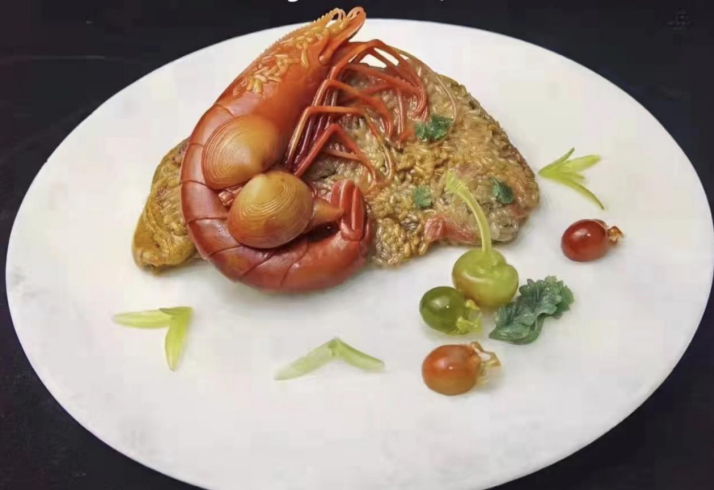 Cette œuvre fait appel à la beauté naturelle non teintée du jade afin d'interpréter à la perfection la culture alimentaire de deux pays de la péninsule ibérique, l'Espagne et le Portugal. L'œuvre comprend la paella, le poulpe grillé et les nouilles frites aux fruits de mer, etc. Les compétences fantomatiques font ricaner les spectateurs.