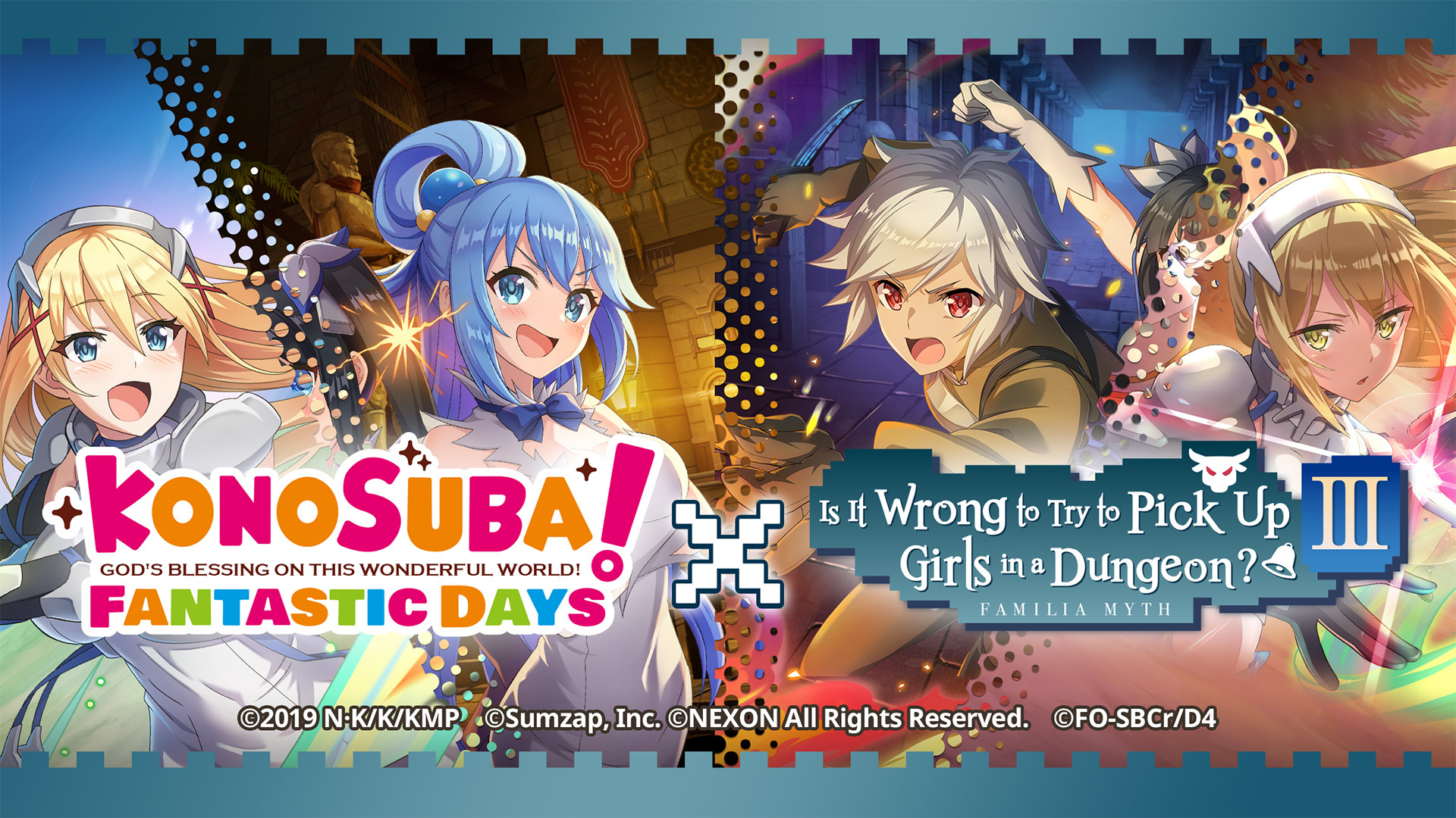 LOS ANGELES--(BUSINESS WIRE)--Aujourd’hui, l’éditeur de jeux numéro un, Nexon, a annoncé que son jeu de rôle (Role Playing Game, RPG) mobile gratuit, KonoSuba: Fantastic Days fera équipe avec la série populaire de « light novels » et de mangas, DanMachi, pour un événement croisé à durée limitée du 26 mai au 9 juin. Les mondes anime de KonoSuba : Fantastic Days et de DanMachi entrent en collision pour une rencontre inédite fantastique !