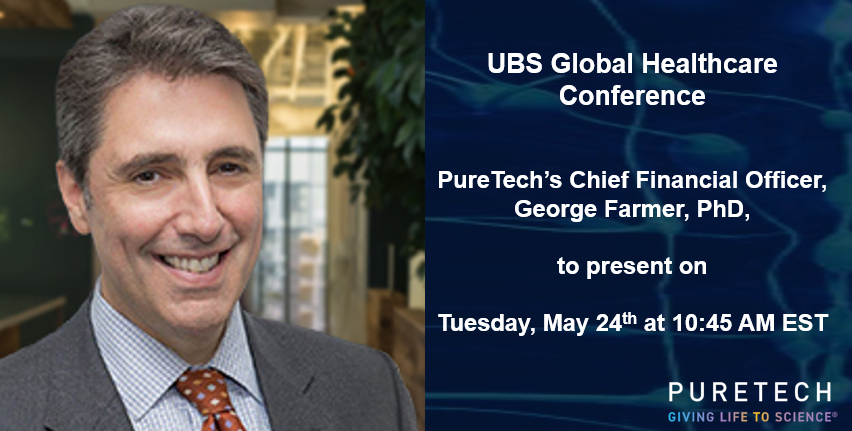 BOSTON--(BUSINESS WIRE)--PureTech Health plc (Nasdaq: PRTC, LSE: PRTC) ("PureTech" or the "Company"), a clinical-stage biotherapeutics company dedicated to discovering, developing and commercializing highly differentiated medicines for devastating diseases, today announced that George Farmer, Ph.D., Chief Financial Officer, will present at the UBS Global Healthcare Conference on Tuesday, May 24, 2022, at 10:45am EDT. A webcast of the presentation will be available at https://investors.puretechhealth.com.