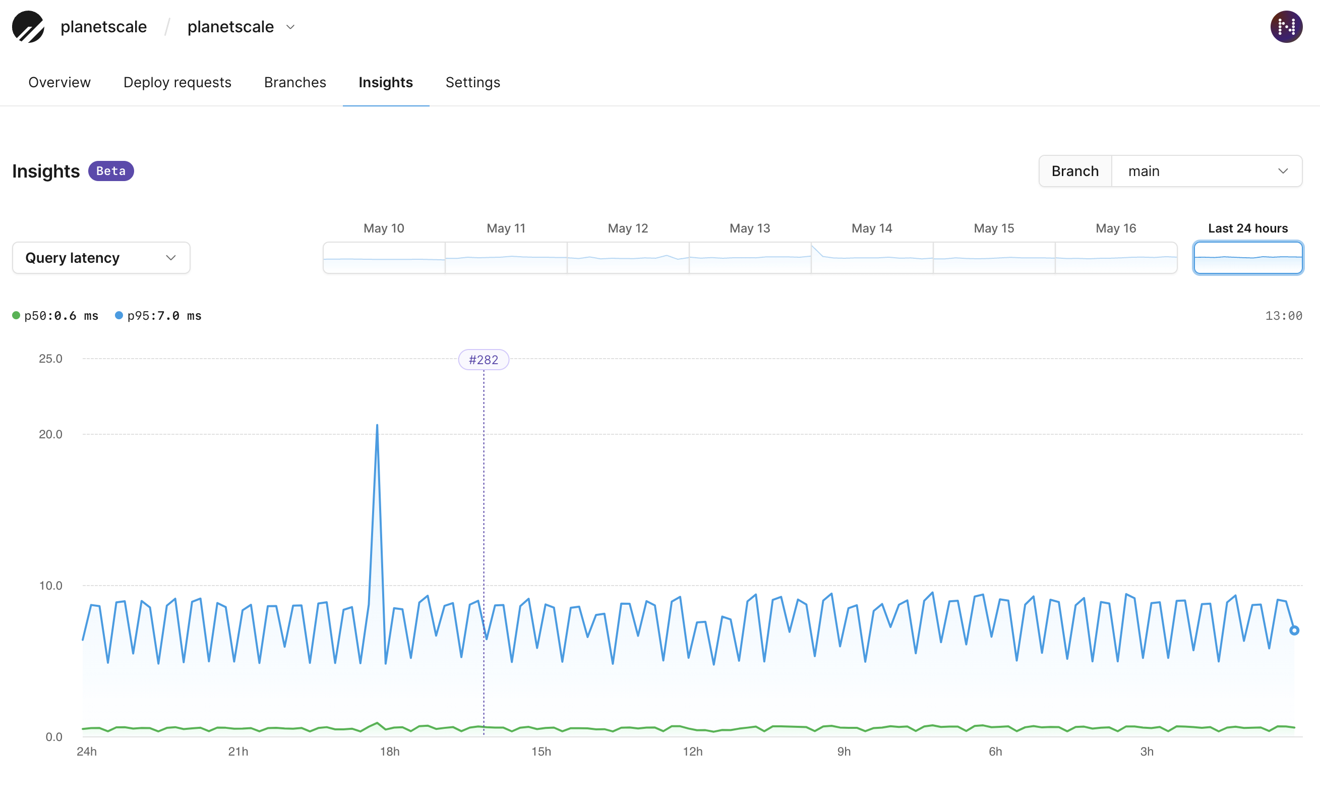 - PlanetScale Insights leverage PlanetScale’s unique ability to record every single query, giving users detailed database performance metrics and enabling them to identify troubling queries in seconds. Fully-integrated, real-time insights into database performance are provided without having to install a third-party APM, and increase performance by allowing users to see which queries could be optimized in real-time. This also lets users see how many rows their queries scanned to better understand their billing usage. Graphs time-stamped with deploy requests and schema changes show how releases are affecting performance.