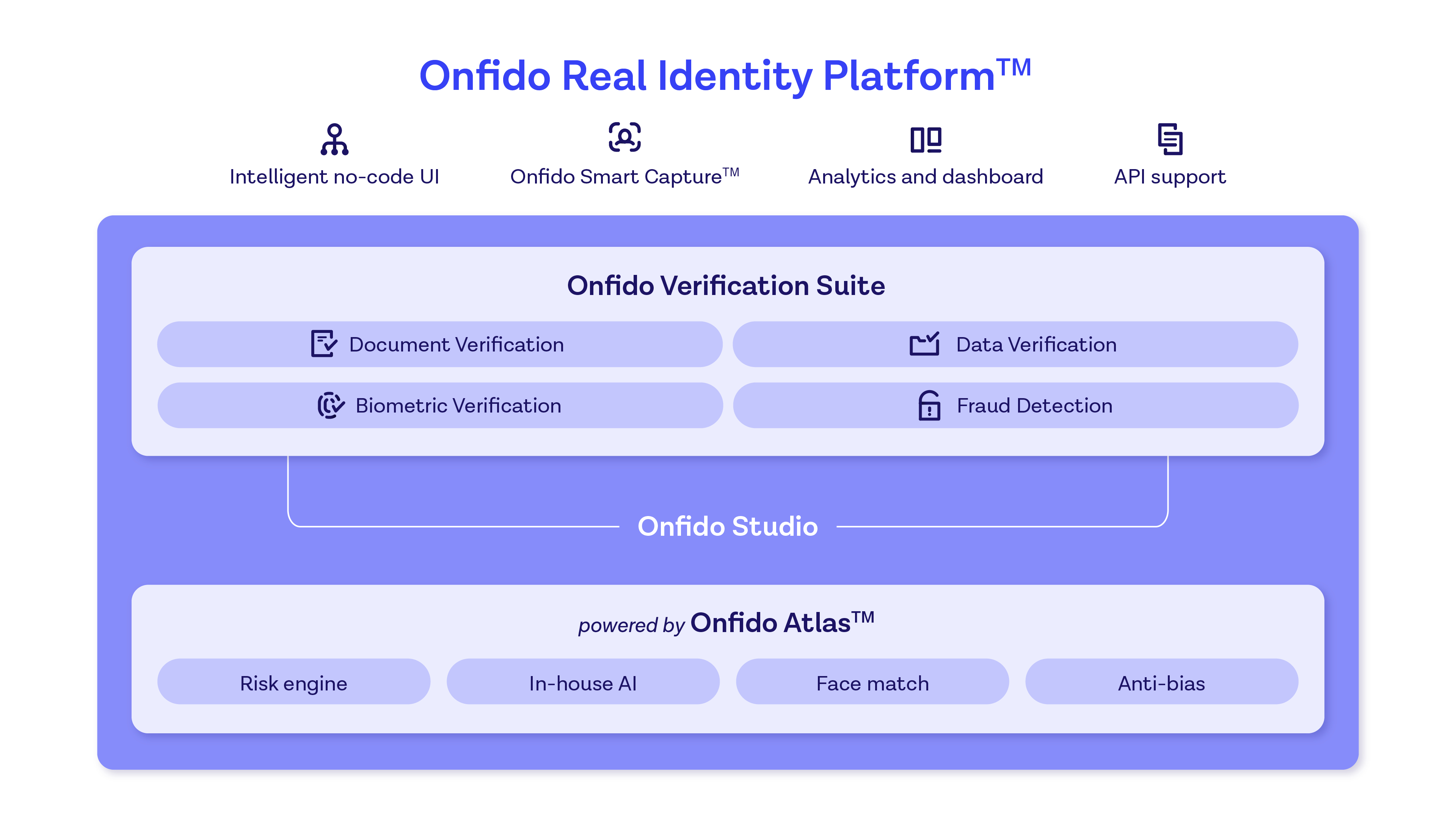 - Onfido Verification Suite,專門建構的身分驗證服務庫,包含屢獲殊榮的文件和生物識別解決方案、可信資料來源和創新的反欺詐措施。