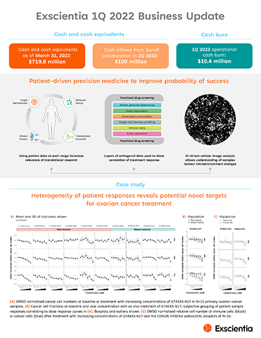 Recente ontwikkelingen in de pijplijn, samenwerkingen en activiteiten van het bedrijf, evenals financiële resultaten voor het eerste kwartaal van 2022, worden hieronder samengevat. Daarnaast zal Exscientia een telefonische vergadering houden op donderdag 26 mei om 13.30 uur. BST/ 8:30 a.m. ET om een overzicht te geven van het platform voor precisiegeneeskunde van het bedrijf.
