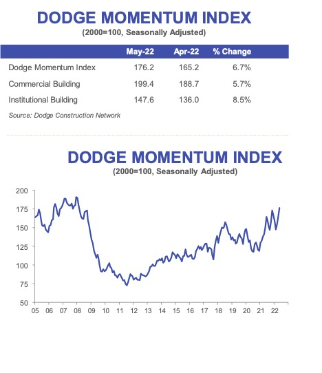The Dodge Momentum Index (DMI) jumped 7% in May to 176.2 (2000=100), up from the revised April reading of 165.2.