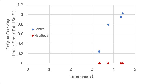 “The graph shows that cracking continues to grow in the control section,” LaCroix said. “The cracking has crossed a threshold of one linear foot of crack per square foot of pavement, which means it is showing up enough that a driver would start to observe the pavement is cracking. NewRoad® is still looking and performing like a new road!”
