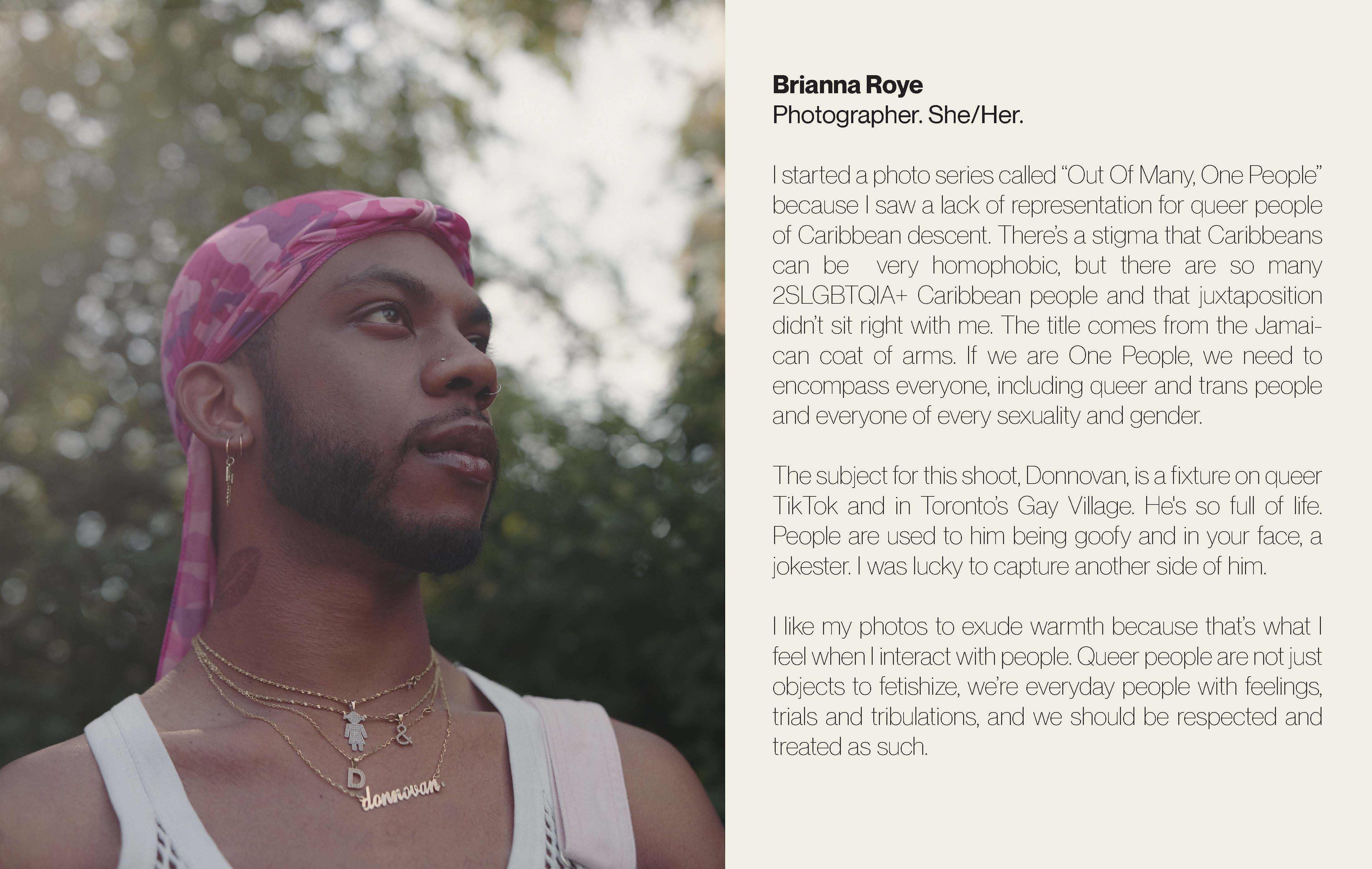 Donnovan, le modèle de Brianna Roye pour cette séance photo, est une figure de proue queer tant sur TikTok que dans le village gai de Toronto. Les deux complices ont passé la journée à parler de leur culture commune – Donnovan étant Jamaïcain et Guyanais – et se sont arrêtés pour prendre des photos à différents pâtés de maisons pendant leur marche dans le quartier West End de Toronto. « Donnovan déborde de joie de vivre », a déclaré Brianna Roye. « Les gens ont l’habitude de le voir faire le bouffon ou adopter une attitude provocante et désinvolte. J’ai eu lachance de capturer une autre des nombreuses facettes de sa personnalité. »