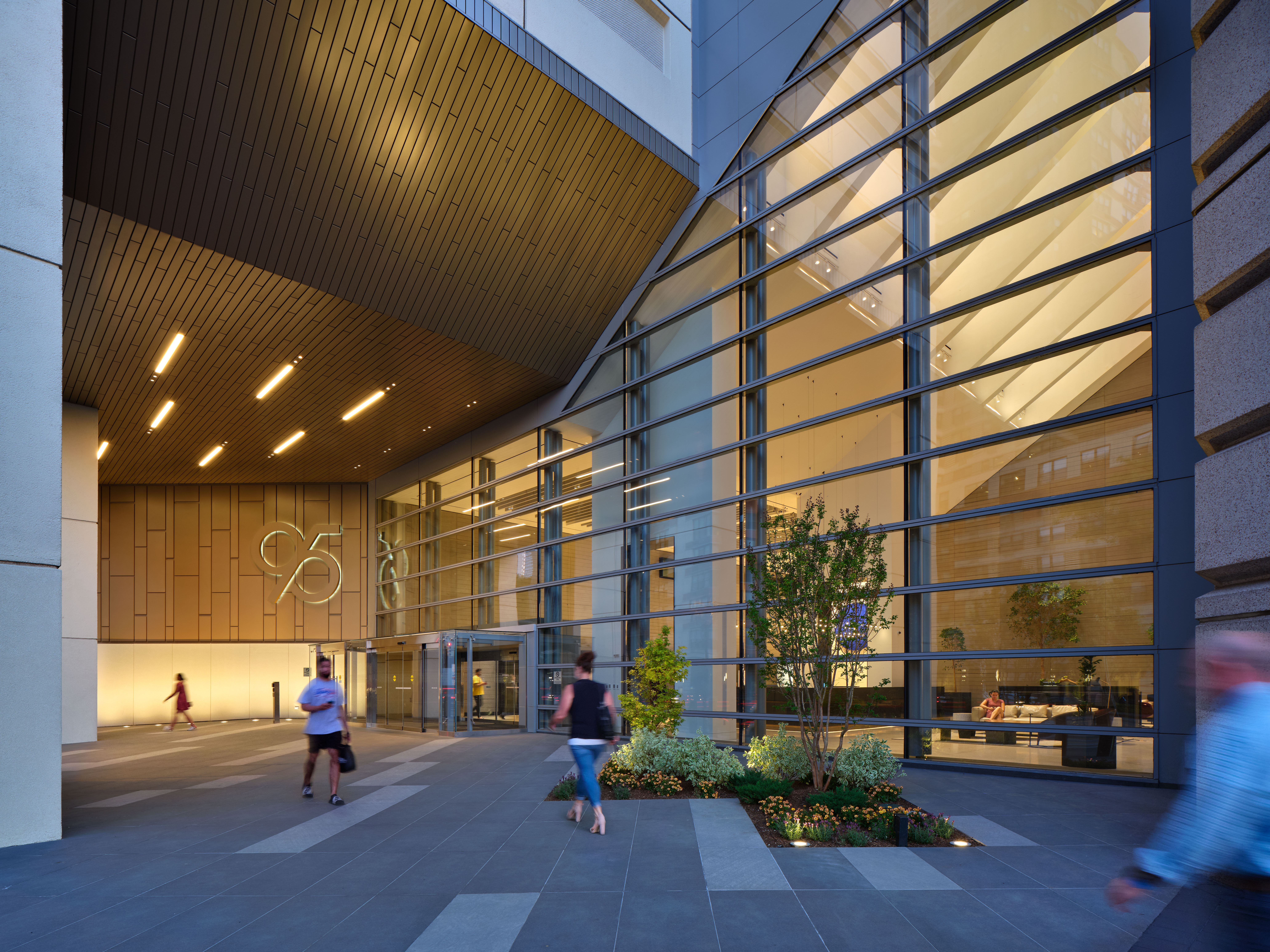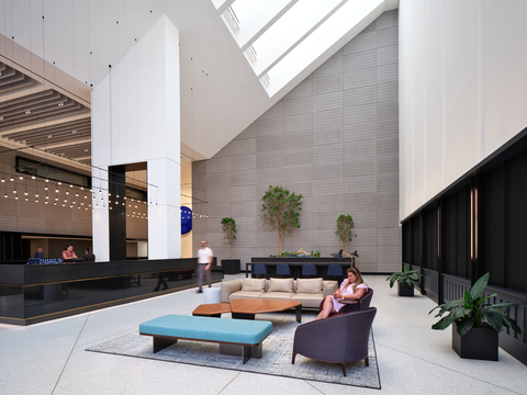 The fresh lobby design was carried out along the base of the building by recladding the retail spaces and repainting the building’s façade. Landscaping and seasonal greenery further activate the entrance and add a natural, biophilic aesthetic. The storefronts have been reinvented with new glass windows and a signage band to raise their visibility. Additionally, terracotta panels along the base of the building near the parking garage add texture and color, giving movement along the pedestrian path to-and-from the building.