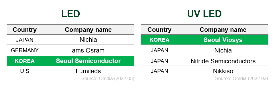 Seoul si è classificata prima al mondo nel settore dei LED ultravioletti (UV) grazie allo sviluppo e alla produzione di massa di questi LED. L’azienda detiene anche da due anni la terza posizione nella categoria dei LED a luce visibile.