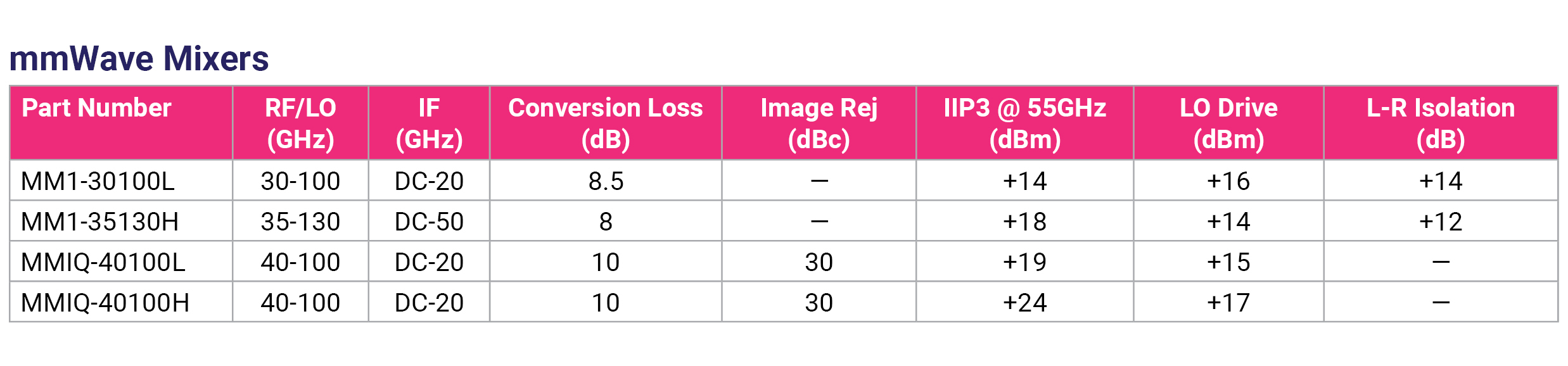 Sampling for the mmWave mixers is estimated to begin in July. The MM1-30100L, MMIQ-40100L and MMIQ-40100H are available in bare die or a connectorized M-package, while the MM1-35130H is currently offered in die form only. Specifications subject to change without notice. For samples and sales information, contact sales@markimicrowave.com.