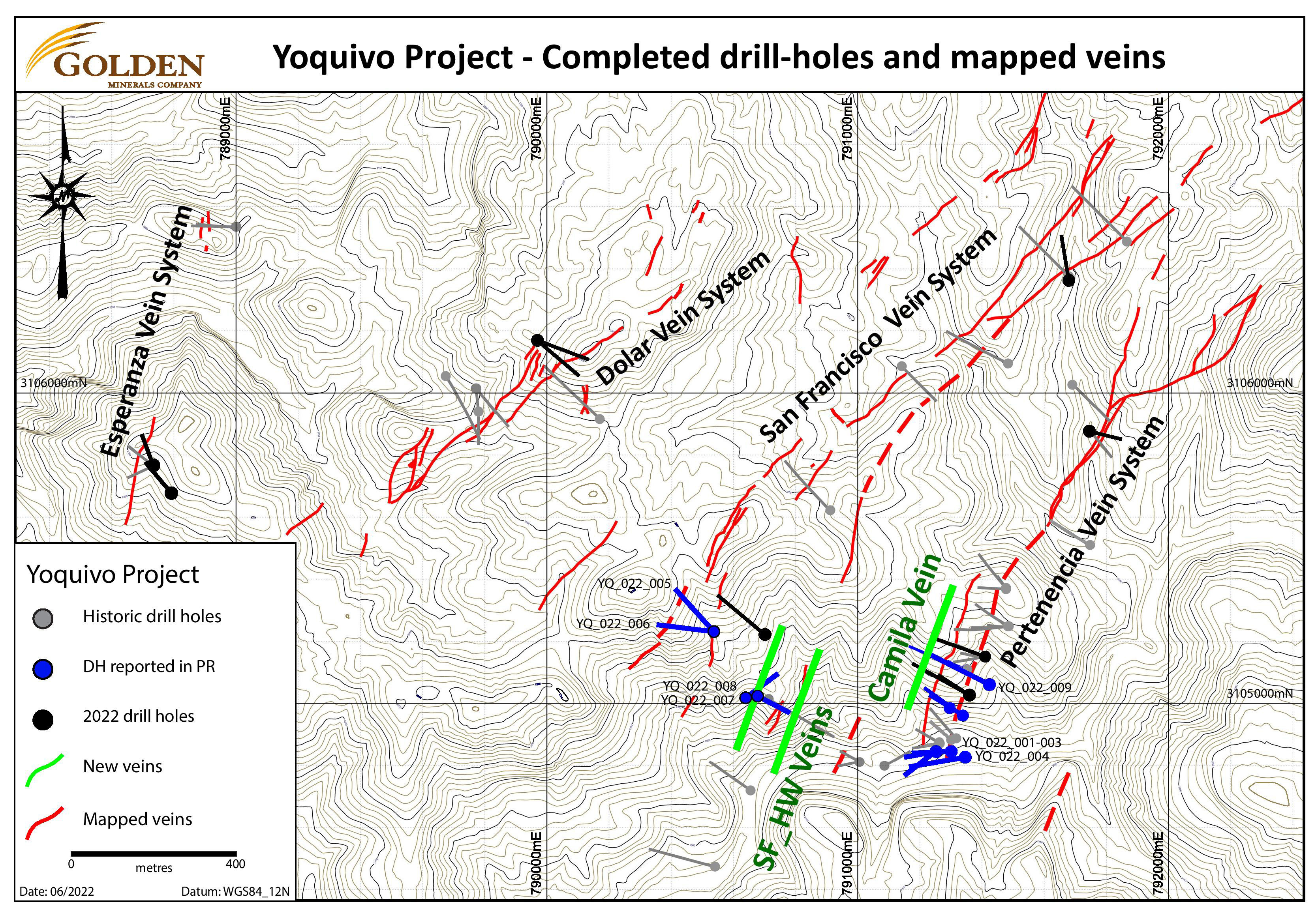 “This most recent drilling has focused on testing the Pertenencia vein system to extend the known mineralized strike length into previously untested areas. The Pertenencia vein has continued to return strong gold-silver grades, and the vein remains open to depth and to the north. The discovery of multiple, previously unknown, high-grade gold-silver structures, particularly the Camila vein, demonstrates that there is also significant potential at Yoquivo to discover additional high-grade structures on the property. The current drill program is expected to allow us to report an initial gold-silver resource on the property later this year,” said Warren Rehn, President and Chief Executive Officer of Golden Minerals.