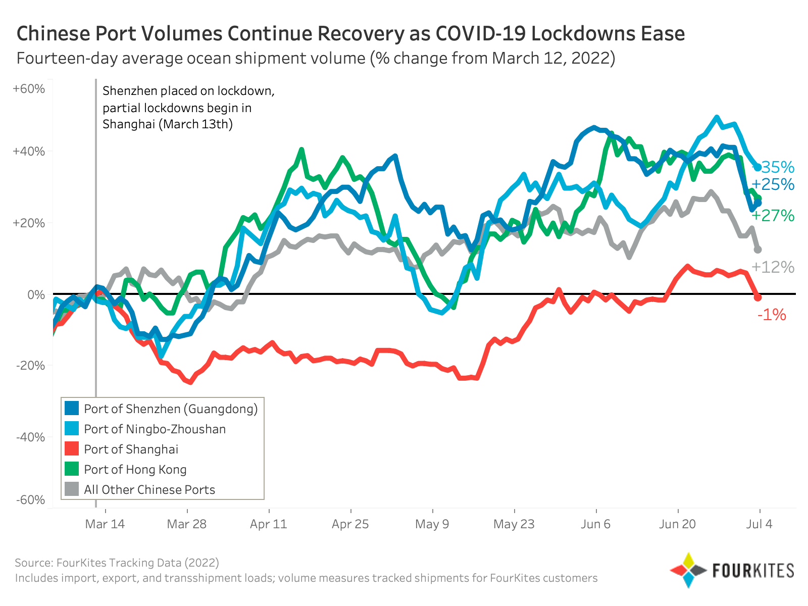 FourKites heeft de afgelopen weken een herstel gezien van het import- en exportvolume van zeevracht in Chinese havens omdat de COVID-19-lockdowns afnemen.