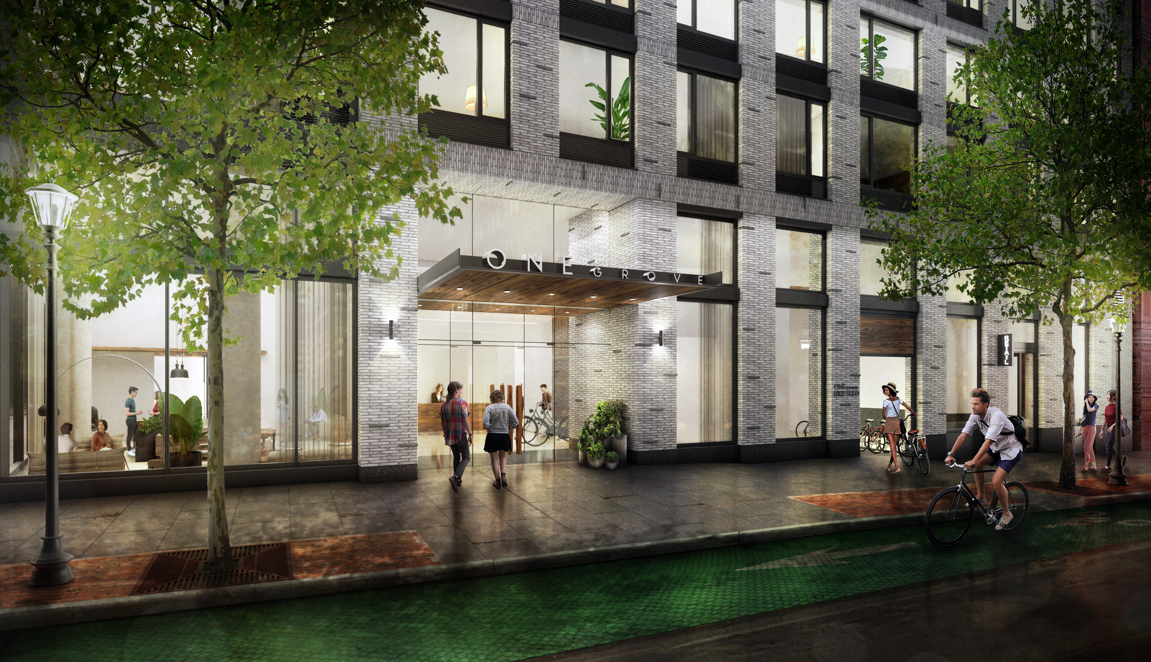 Residents of One Grove will enjoy an interior design aesthetic that combines natural inspirations and a neutral palette, with an acknowledgement of the beauty in the imperfection of natural materials. Raw textures, earthy hues and organic, natural materials are beautifully integrated with beige, cream, black, taupe and grey color palates. Ceramic, wood and stone textures align to provide an authentic materiality. The goal is to create an atmosphere of serenity with an uncluttered sense of comfort, beauty, and enveloping luxury. Amenities include luxury bespoke finishes, smart home features, private balconies, outdoor landscaped rooftop terrace, lounge and private dining room, gym, coworking space, bike room and parking garage with shared transportation options, and ground floor retail and parking.